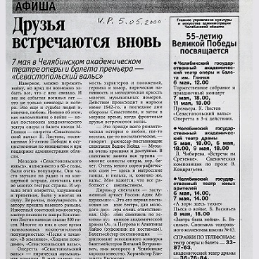 Впоследствии в театре не раз обращались к постановкам спектаклей на военную тематику. В разные годы на челябинской сцене шли оперы «Два капитана» Григория Шантыря и «Зори здесь тихие» Кирилла Молчанова, балеты «Материнское поле» Калыя Молдобасанова и «Альпийская баллада» Евгения Глебова, оперетта «Севастопольский вальс» Константина Листова. В театральном архиве мы нашли раритетные фотографии и программки к этим спектаклям.