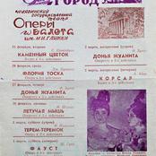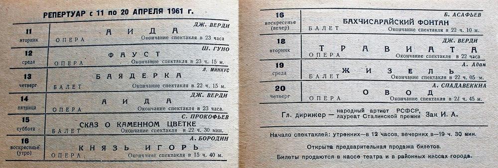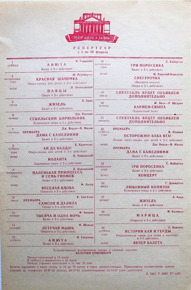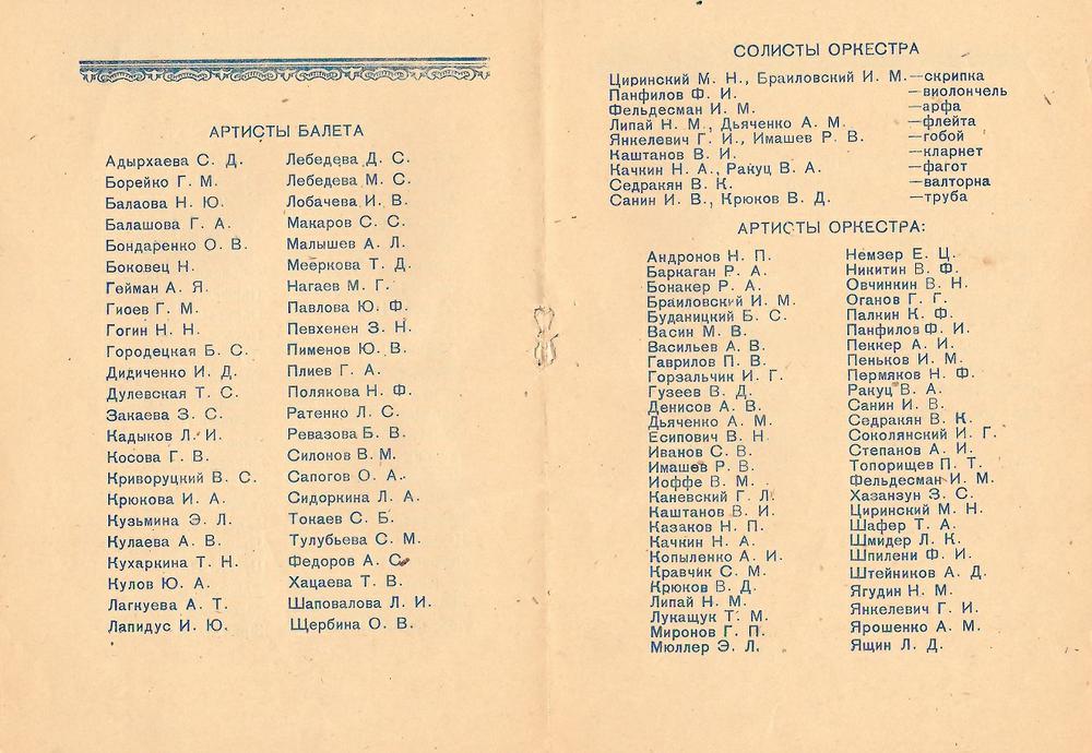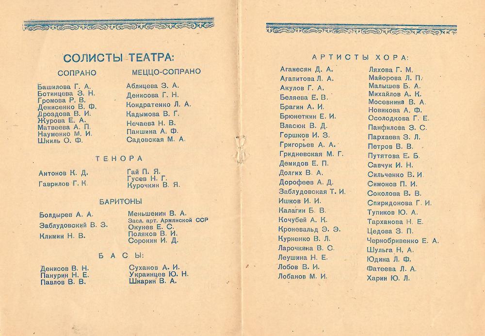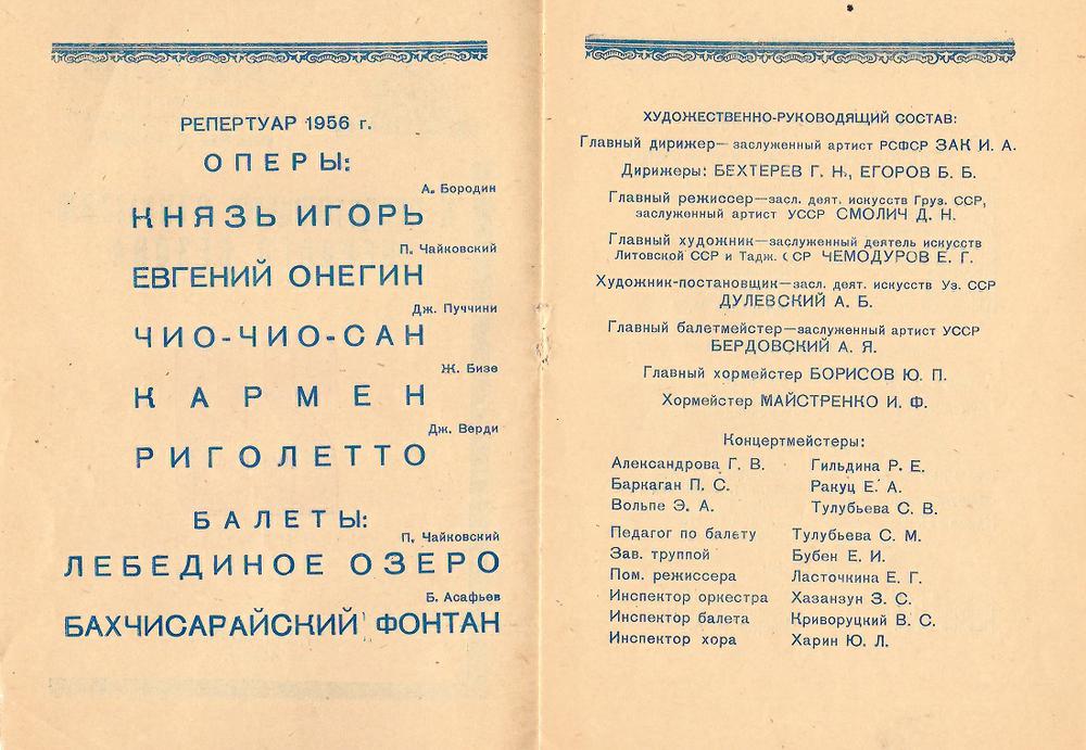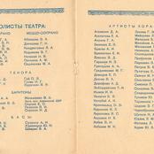1956 год, буклет1956 год, буклет1956 год, буклет1956 год, буклет1956 год, буклет1956 год, буклет1956 год, заслуженная артистка РСФСР Вера Дикопольская в роли Ярославны в опере Князь Игорь1956 год, народная артистка СССР Адырхаева Светлана - Зарема в балете Бахчисарайский фонтан1956 год, поздравление с открытием театра1957 год, Диана Лебедева - Танечка, народная артистка Беларусской ССР Клара Малышева - Ванечка в балете Айболит1957 год, Евгений Окунев - Риголетто в опере Риголетто 19571957 год, заслуженная артистка РСФСР Клавдия Сидорова в роли Маддалены в опере Риголетто1957 год, Ионас Капланас в роли Хозе в опере Кармен1958 год, заслуженный артист РСФСР Владимир Постников - Феб, народная артистка РФ Галина Борейко - Эсмеральда в балете Эсмеральда1958 год, программка 100 лет балету Лебединое озеро1958 год, Тамара Дулевская и заслуженный работник культуры РСФСР Владимир Криворуцкий в балете Большой вальс1959 год, заслуженная артистка РСФСР Клавдия Сидорова - Весна в опере Снегурочка1959 год, заслуженный артист Виталий Шкарин - Монтанелли в опере Овод1959 год, Олеся Хоменко в балете Цветок счастья1959 год, Раиса Громова - Джемма в опере Овод1959 год, сцена из балета Цветок счастья1960 год, заслуженная артистка РСФСР Лариса Ратенко - Жизель, заслуженный артист РСФСР Владимир Постников - Альберт в балете Жизель1960 год, Диана Лебедева - Катерина в балете Каменный цветок1960 год, заслуженный артист РСФСР Владимир Постников - Данила в балете Каменный цветок1960 год, заслуженный артист РСФСР Владимир Постников, заслуженная артистка РСФСР Лариса Ратенко, Диана Лебедева в балете Каменный цветок1960 год, народная артистка Белорусской ССР Клара Малышева - Никия в балете Баядерка1960 год, Нинель Степанова - Мирта в балете Жизель1961 год Светлана Емец - Аида в опере Аида1961 год, апрельский репертуар1961 год, апрельский репертуар1961 год, апрельский репертуар1961 год, заслуженная артистка РСФСР Нина Шайдарова - Амнерис в опере Аида1961 год, заслуженная артистка РФ Ирина Сараметова - принцесса Аврора и Тамара Дулевская - Кошечка в балете Спящая красавица1961 год, народный артист БССР Игорь Сорокин - Амонасро в опере Аида1961 год, сцена из балета Последний бал1962 год, афиша Маскарад1962 год, афиша1962 год, заслуженная артистка РСФСР Вера Дикопольская - Флория Тоска в опере Тоска Тоска1963 год, Алексей Прончев - Манрико, заслуженный артист РСФСР Владимир Агафонов - граф ди Луна в опере Трубадур1963 год, Владимир Поляков, заслуженный работник культуры РФ Герман Гаврилов и Клавдия Новикова в оперетте Цыганский барон1963 год, заслуженная артистка РСФСР Клавдия Сидорова - Азучена в опере Трубадур1963 год, заслуженная артистка РСФСР Нина Шайдарова - Азучена в опере Трубадур1963 год, заслуженная артистка РФ Ирина Сараметова - Джульетта в балете Ромео и Джульетта1963 год, сцена из балета Тщетная предосторожность1964 год, Владимир Поляков - Маркиз в оперетте Корневильские колокола1965 год, Светлана Хайт - Лакме, заслуженный артист РСФСР Ефим Лудер - Джеральд в опере Лакме1965 год, афиша Лакме1965 год, Галина Пиганова - Катя, заслуженный артист РСФСР Виталий Шкарин - Кораблев, Анатолий Озеров - Саня в опере Два капитана1965 год, заслуженная артистка РФ Ирина Сараметова - Золушка, Владимир Нарский - Принц в балете Золушка1965 год, заслуженный артист РСФСР Валентин Гриченко - Борис в опере Борис Годунов1965 год, программка к опере Два капитана1966 год, афиша га