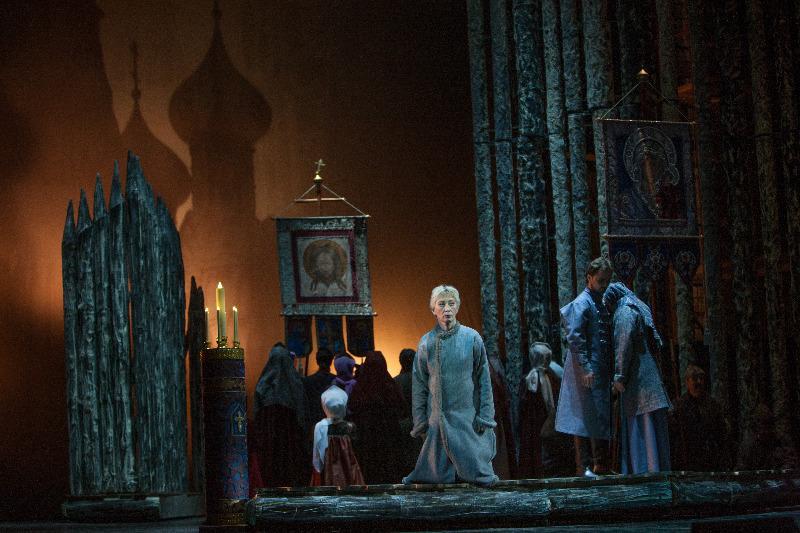 В финале задник открывается, мы видим силуэт Покровского собора на Красной площади в Москве — только здесь сценограф позволяет себе дать больше цветового разнообразия, дать почувствовать публике величие и торжественность народного праздника обретения законного государя: здесь и привычные хоругви, и нарядные костюмы (которые в целом в опере очень удачны).