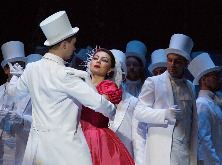 Ларинский бал (тот, где происходит ссора друзей — Онегина и Ленского) с самого начала больше походит на похороны: гости одеты в черное и темно-зеленое, словно предчувствуют роковой финал этого празднества. Великосветский бал в Петербурге вроде бы наряден и торжественен — балетные пары в ослепительно-белом (как и предписывает отечественная традиция от Бориса Покровского) — но больше напоминает жесткий сюр. Вернувшийся «из дальних странствий» Онегин смотрит на веселье сквозь туманную пелену. Ему видятся убитый поэт Ленский, Ольга и провинциальная жизнь, которую он презирал, бежал от нее, но теперь о ней очень скучает.