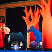 Художник-постановщик Софья Кобозева создала на сцене два мира: реалистичный и фантазийный с синими лошадьми, красными деревьями и многим другим.