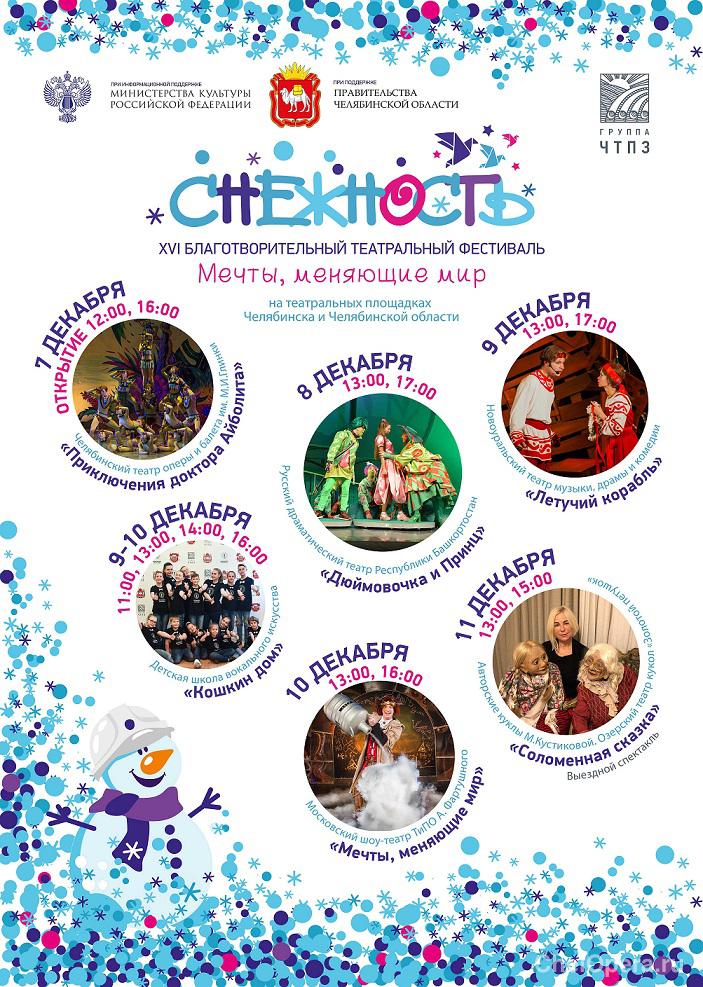 В этом году в рамках XVI благотворительного фестиваля «Cнежность. Мечты, меняющие мир» с 7 по 17 декабря в пяти городах Челябинской и Свердловской областей, Республики Татарстан – Челябинске, Озёрске, Кусе, Первоуральске и Альметьевске – свои постановки представят 10 российских театральных коллективов. Детская школа вокального искусства, созданная по инициативе акционеров Группы ЧТПЗ при Челябинском театре оперы и балета, покажет премьерный спектакль – оперу «Кошкин дом». Впервые на Урал приедет Московский шоу-театр ТиПО А. Фартушного с научно-познавательной программой «Мечты, меняющие мир», аналога которой нет в России. Уфимский драматический театр порадует зрителя мюзиклом «Дюймовочка и Принц» в необычной рок-аранжировке. Ещё одним открытием «Снежности» станет спектакль «Алиса в стране чудес» продюсерского центра «Триумф», сочетающий живую музыку и 3D-графику.