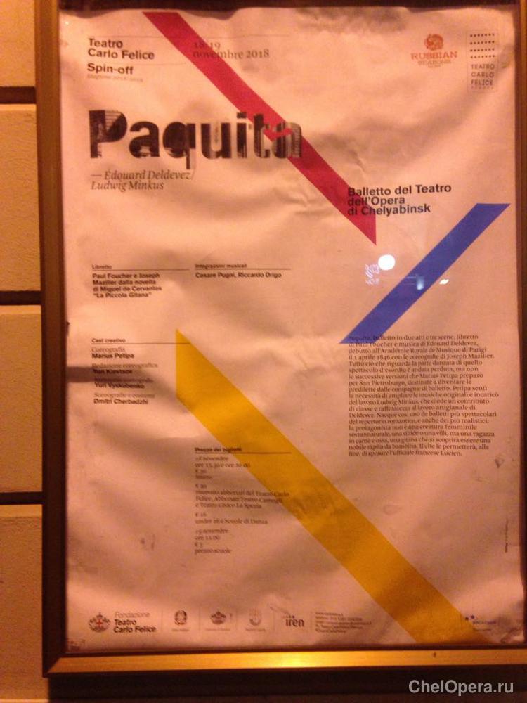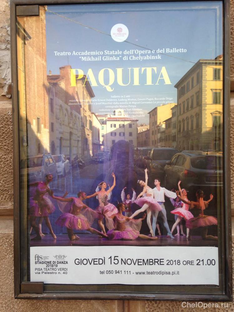 Коллектив челябинского театра привёз на «Русские сезоны» знаменитый балет «Пахита» и гала-концерт, в первом отделении которого зрители увидели восстановленную постановку «Шопенианы». Выступления с успехом прошли в шести городах: Гориция, Генуя, Камольи, Ла Специя, Сиена и Пиза.