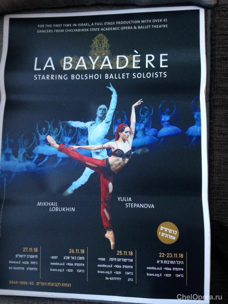 Челябинский коллектив выступил в крупнейших городах Израиля: Тель-Авив, Хайфа, Беэр-Шева и Иерусалим. Вместе с нашей труппой в спектаклях приняли участие артисты главного российского театра. Прима-балерина Юлия Степанова и премьер Большого театра, заслуженный артист России Михаил Лобухин исполнили в «Баядерке» главные партии.