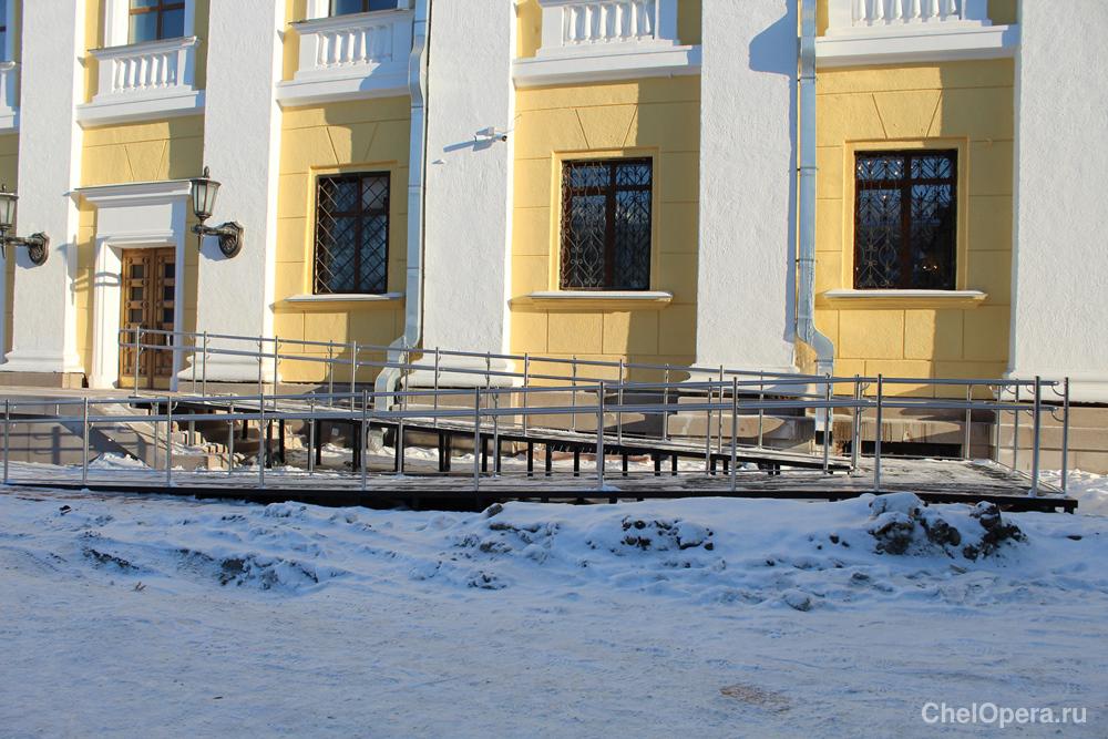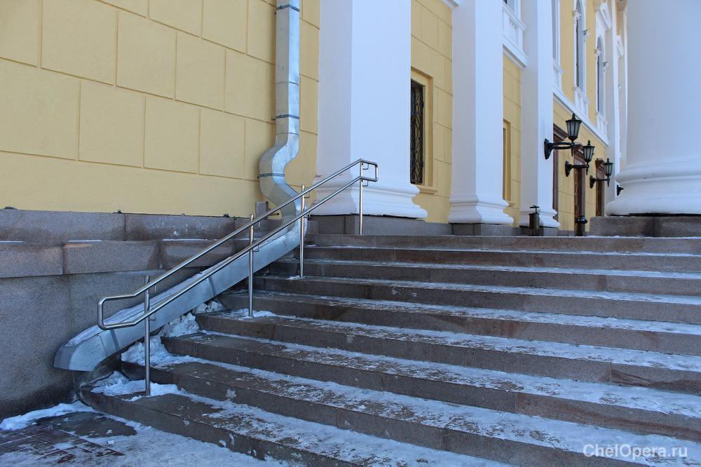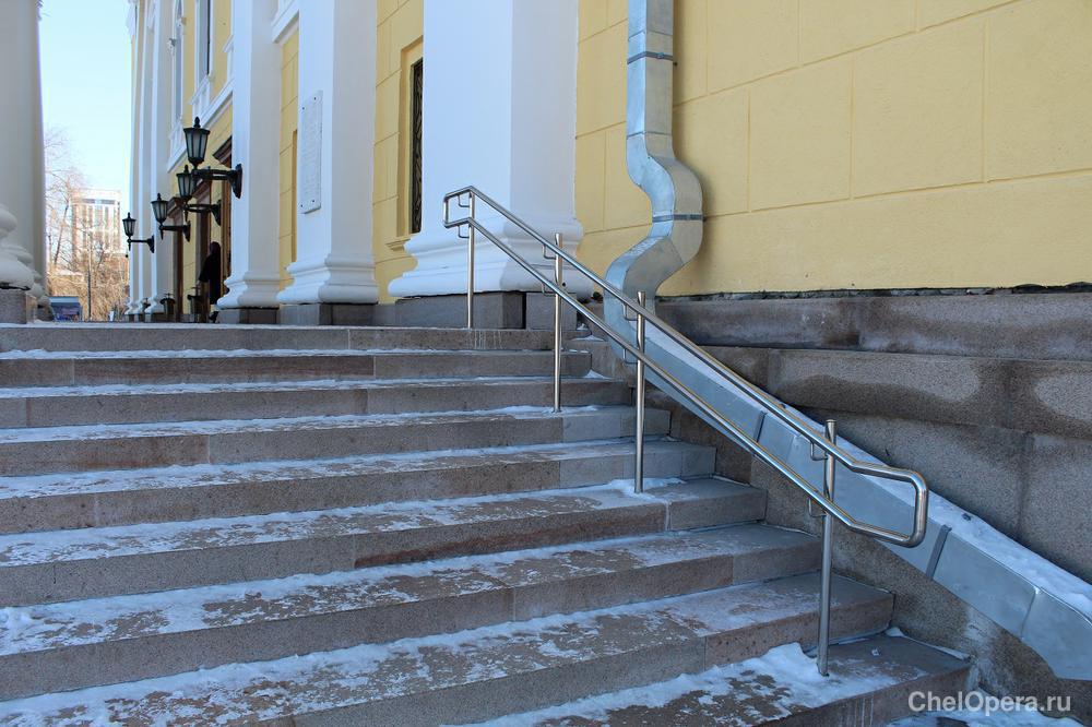 Теперь лестница главного входа с двух сторон оборудована перилами. Кроме того, на входе в театр со стороны улицы Кирова был установлен пандус для людей с ограниченными физическими возможностями.