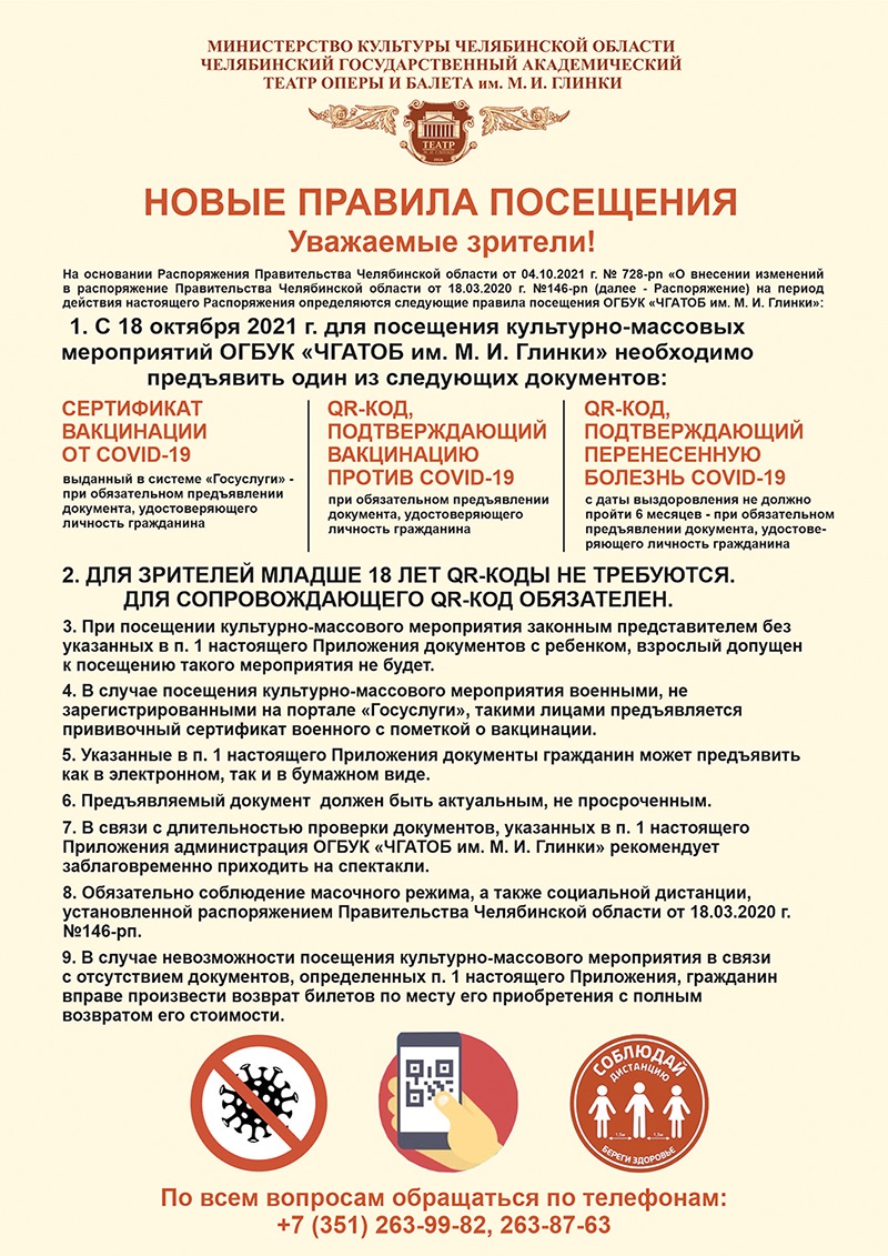 - Зрители допускаются на спектакль при наличии защитной маски (респиратора). При необходимости театр обеспечит зрителю возможность приобретения средств индивидуальной защиты органов дыхания (масок).