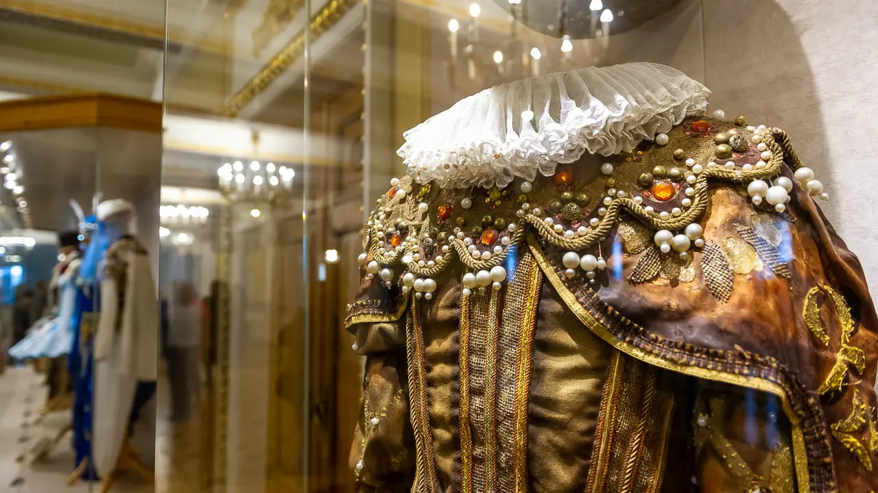 Поднимаемся на пару этажей выше. Здесь красота: за стеклом выставлены архивные костюмы, многим уже почти полвека — они изготовлены в цехах театра начиная с 1974 года, это вещи собственного производства. А есть и отданные в дар, совсем почтенного возраста. Например, одеяние Бориса Годунова — от Большого театра, оно сшито в... 1950 году.