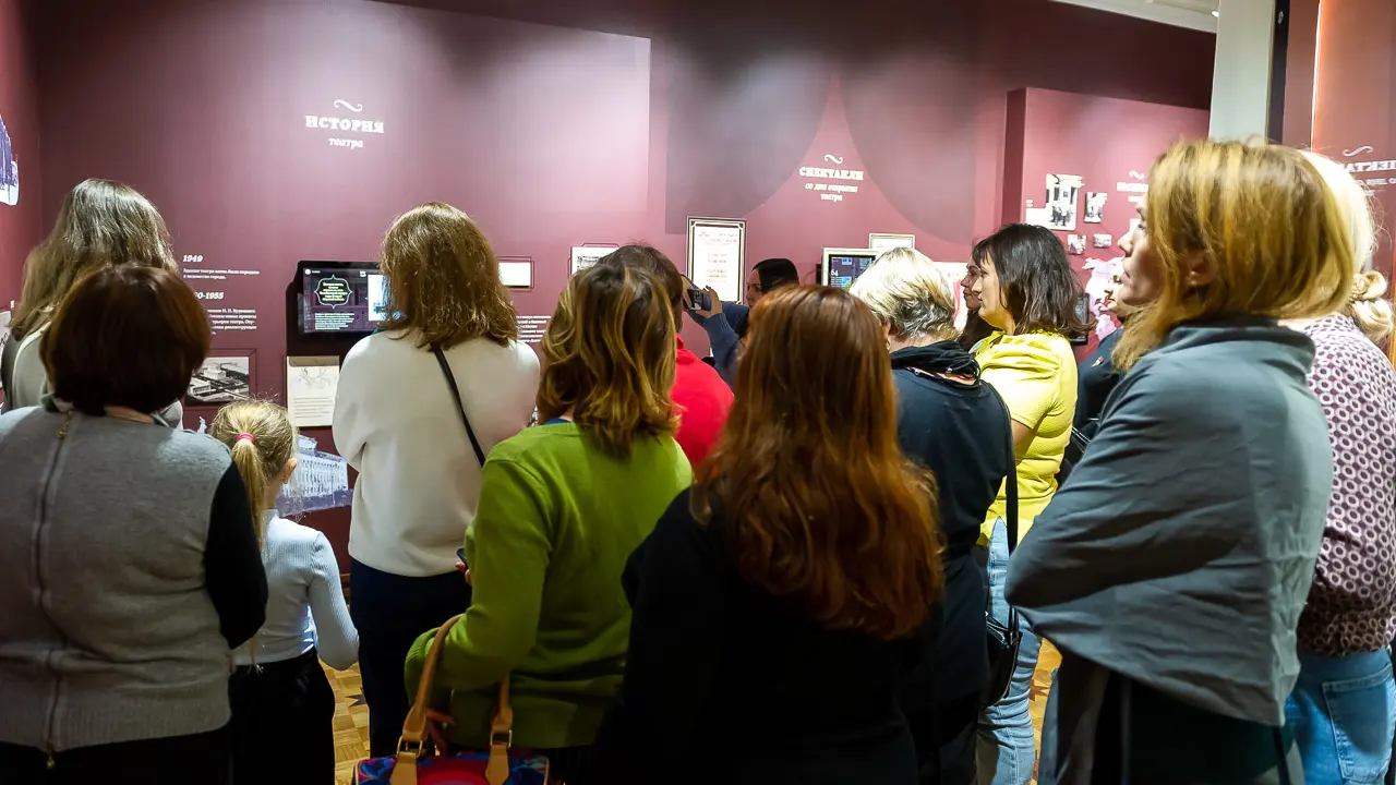 Далее двигаемся в музей театра — он такой новый, современный, интерактивный! Мелькает видео на стендах. Размещены фото и рисунки театра в проекте — он, оказывается, предполагался совсем другим: в стиле... аскетичного конструктивизма. Но это было в тридцатые годы, а затем вмешалась война. В начале сороковых почти готовое здание было передано под эвакуированный в Челябинск «Калибр». И здесь делали... патроны.