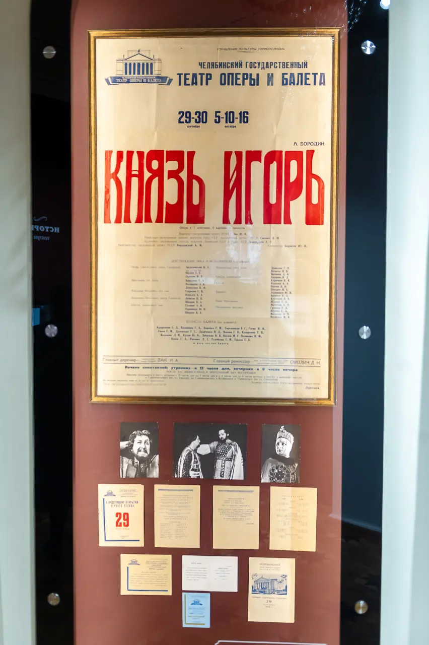 А еще тут есть пианино XIX века с клавишами слоновой кости, уникальные старые пуанты и «запчасти» к ним и даже афиша первого спектакля в Челябинском театре оперы и балета: «Князь Игорь». И многое другое, даже интерактивная гримерка: жмешь на сенсорный экран — и вуаля, в нем ты уже загримирован под выбранного персонажа!