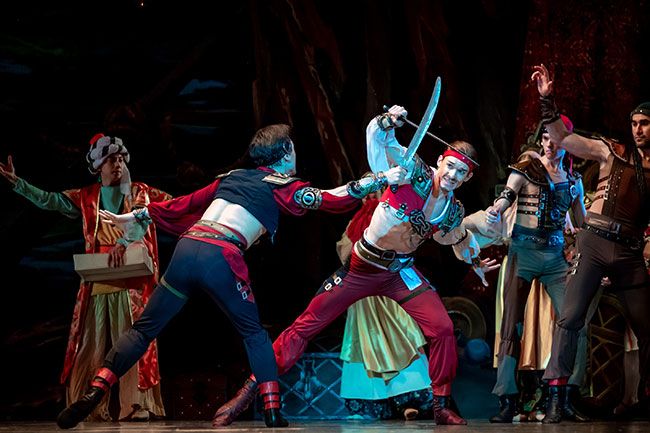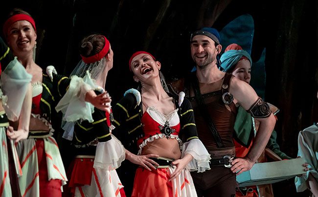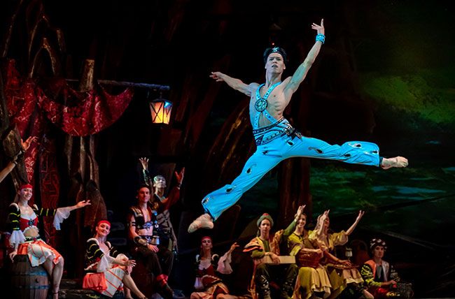 — В нем много красивых массовых сцен, в том числе есть драки на настоящих саблях, — говорит исполнитель партии главного героя, предводителя корсаров Конрада Алексей Шакуро. — Каждая постановка должна чем-то отличаться. И художники новое привносят, и хореографы, и музыка звучит по-новому. Бои — это, конечно, особенно интересно. Когда мы сражаемся, искры летят. Красочные декорации: корабль, шторм, восточный дворец, задействовано множество спецэффектов. Энергия, эмоции, страсти! Артистам тоже это нравится. Для моего персонажа важен героизм. Поскольку я человек скромный, мне надо было это из себя доставать. Спасибо педагогам, надеюсь, у меня все получается.