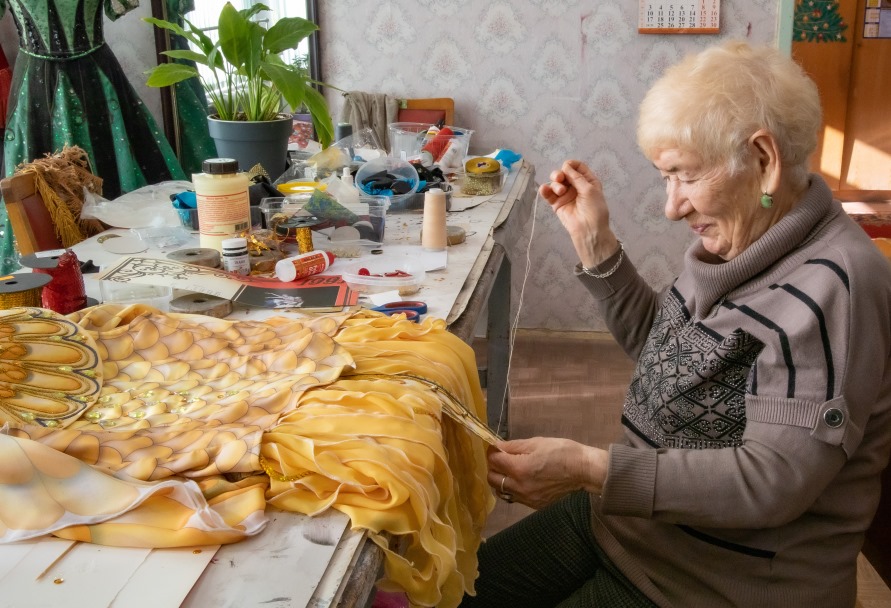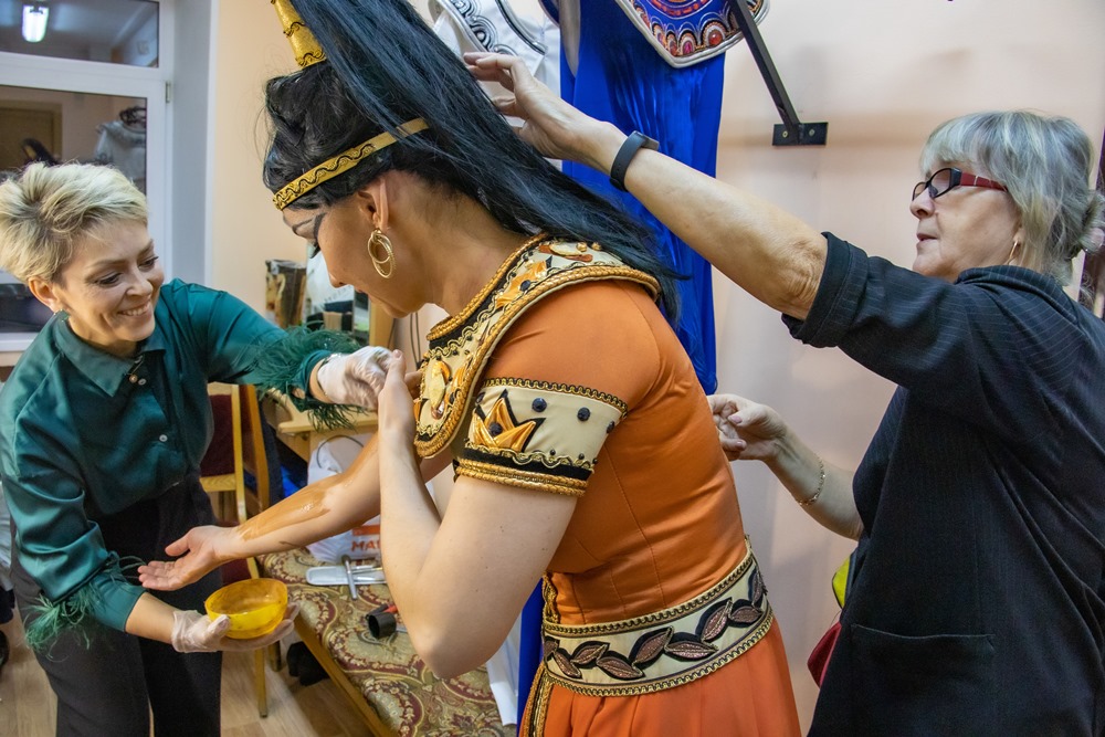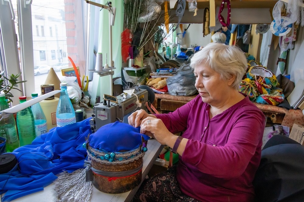 Завершенный вид костюмы обретают в руках художников-декораторов. Более 30 лет заслуженный работник культуры России Римма Кириллова украшает костюмы бисером, каменьями, кружевом, аппликациями, расписывает специальными красками. А головные уборы изготавливает закройщик-портной Татьяна Дегтярева.