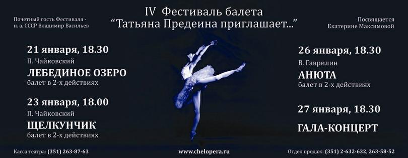 Любимица публики, обладательница «балетного «Оскара» – приза «Душа танца», – Татьяна Предеина исполнит свои лучшие партии. Откроет фестиваль один из самых знаменитых и любимых зрителем балет «Лебединое озеро», 23 января будет показана рождественская сказка «Щелкунчик», а 26 поклонники искусства увидят балет «Анюта», посвященный памяти Екатерины Максимовой. Гала-концерт фестиваля состоится 27 января при участии солистов Большого театра, Кремлевского балета и Музыкального театра им. К.С. Станиславского и Вл. И. Немировича-Данченко.