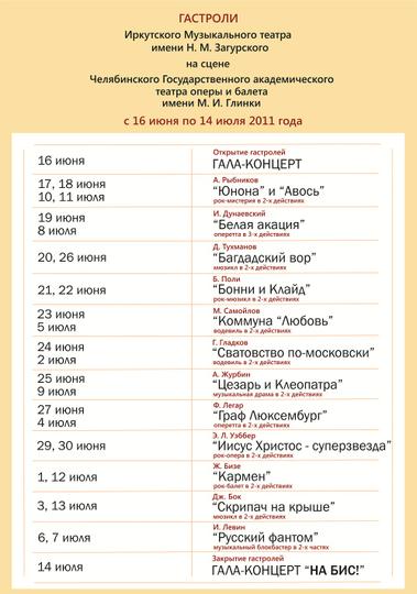 Сегодня администрация Оперного театра подписала договор о гастролях Иркутского Музыкального театра им.Н.М.Загурского, который продолжит свой юбилейный 70-й театральный сезон на Челябинской сцене. Гастроли театра пройдут с 16 июня по 14 июля 2011 года.