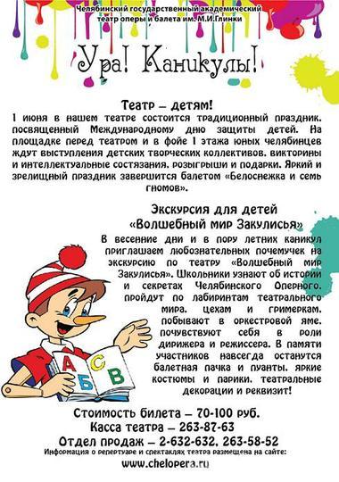 «Театр – детям!» – мероприятие, которым Челябинский Государственный академический театр оперы и балета им.М.И.Глинки ежегодно встречает своих маленьких зрителей и открывает сезон детских спектаклей под девизом «Ура!!! Каникулы!». Этот год не станет исключением, – 1 июня 894 юных зрителя смогут побывать на сказочном балете «Белоснежка и семь гномов» и принять участие в зрелищной и увлекательной игровой программе.