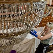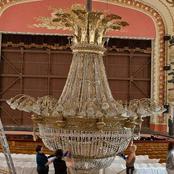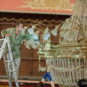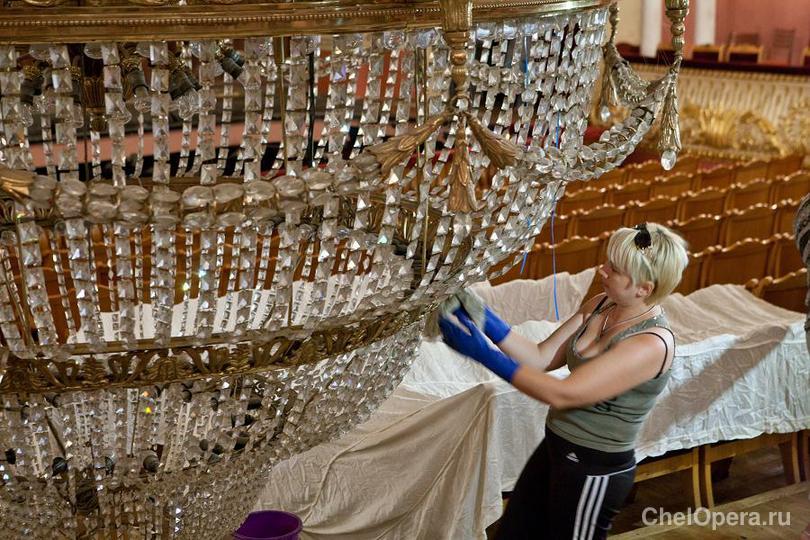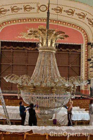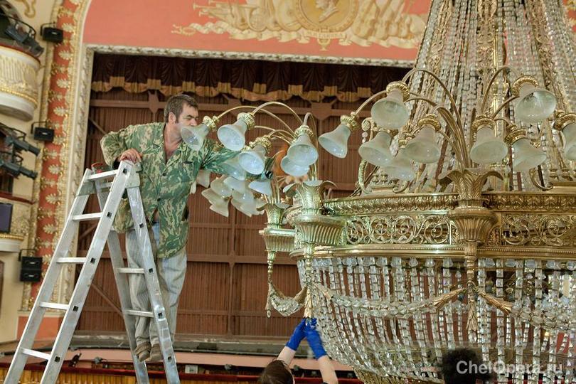 Сотрудники театра осмотрели 450 лампочек, произвели замену перегоревших, отмыли от пыли и придали блеск подвескам из настоящего горного хрусталя и бронзовым декоративным элементам.