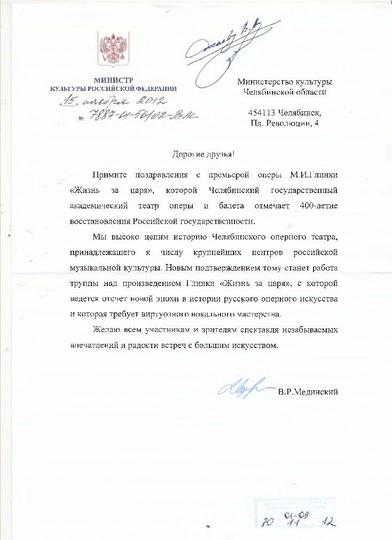 Мы высоко ценим историю Челябинского оперного театра, принадлежащего к числу крупнейших центров российской музыкальной культуры. Новым подтверждением тому станет работа труппы над произведением Глинки «Жизнь за царя», с которой ведется отсчет новой эпохи в истории русского оперного искусства и которая требует виртуозного вокального мастерства.