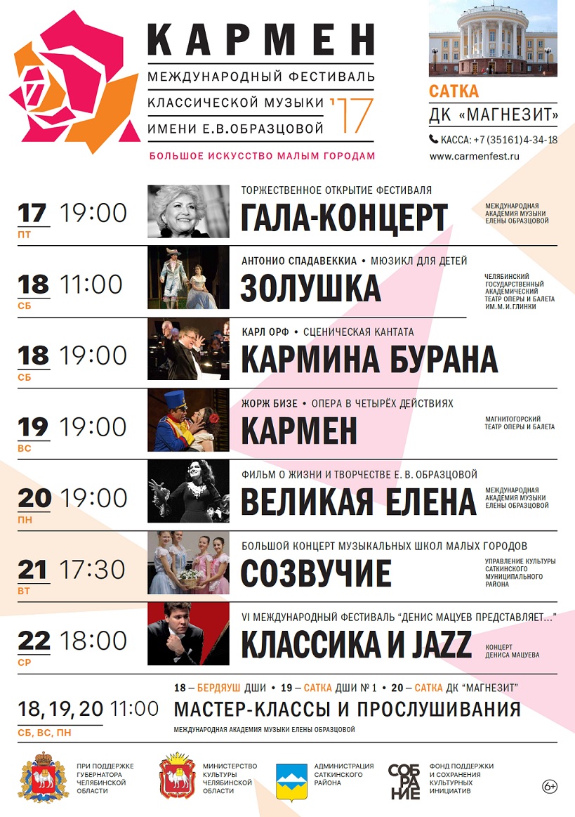 На шесть дней г. Сатка превратиться в международный центр музыки. С 17 по 22 марта там пройдет фестиваль имени выдающейся российской певицы, оперного режиссера, педагога, народной артистки СССР Елены Образцовой. Вокальное искусство и удивительная красота звучания ее голоса приводили в восторг и завораживали публику. А ее исполнение Кармен в одноименной опере Жоржа Бизе во всем мире признано непревзойденным и эталонным. Елена Васильевна выступала в крупнейших театрах и концертных залах мира, включая миланский Ла Скала, нью-йоркскую Метрополитен-опера, лондонский Ковент Гарден, Венскую государственную оперу.