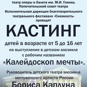 За два с половиной месяца в кастингах приняли участие более 500 мальчишек и девчонок из Челябинска, Миасса, Копейска, а также сел и поселков Челябинской области. 65 из них получили шанс стать частью уникального театрального проекта – мюзикла с рабочим названием «Калейдоскоп мечты». Премьера спектакля состоится в начале декабря в театре оперы и балета им. М. И. Глинки в рамках XV благотворительного фестиваля «Снежность». Юные актеры выйдут на большую сцену вместе с профессиональными артистами.