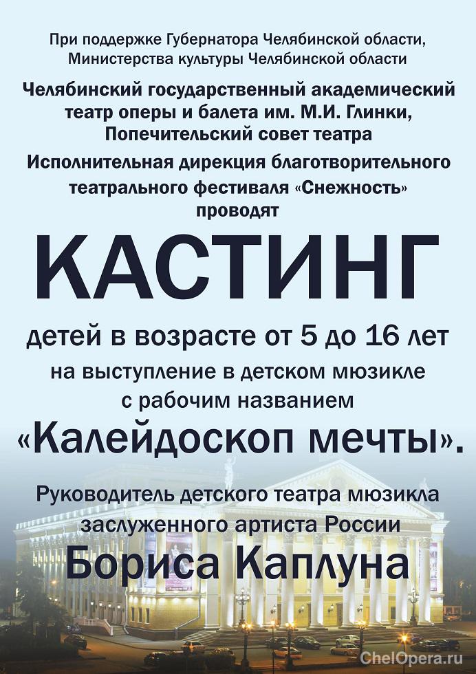 Заявки на участие во втором этапе кастинга принимаются до 10 мая! Мероприятие проводится при поддержке губернатора Челябинской области, министерства культуры Челябинской области, Попечительского совета театра оперы и балета им. М. И. Глинки, исполнительной дирекции благотворительного театрального фестиваля ЧТПЗ «Снежность».