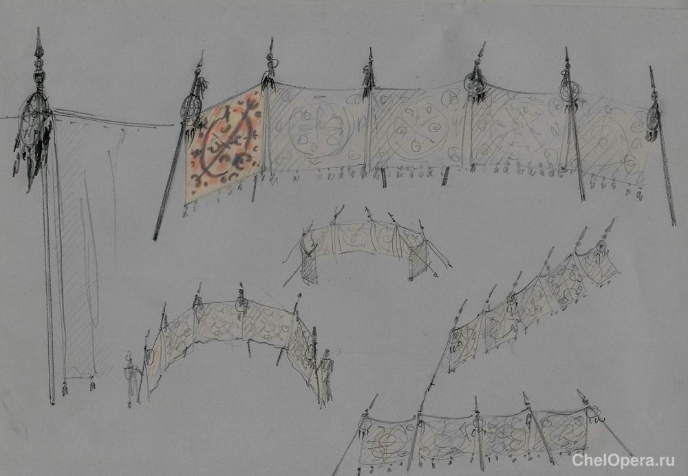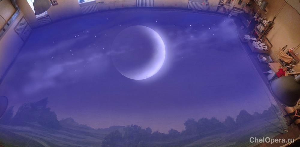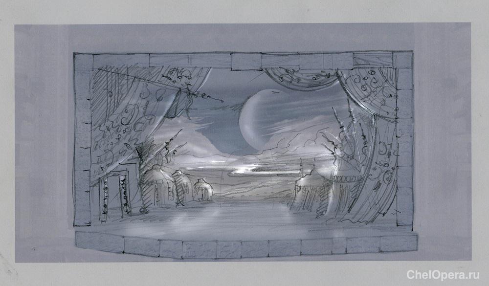 - Одна из сцен, которую мы поменяли, это «Половецкий стан». Первый план в этой картине будет объемным, на втором плане будет роспись, а третий план - силуэтный. Также добавили два плана неба. Должна получиться такая перспективная, воздушная, немного фантазийная картина, - пояснил художник Антон Сластников. – Я добавил растущую Луну, она связана с Востоком, и должна гармонично сочетаться с копьями, шатрами и музыкой. Среди реквизита появляется такой элемент, как копья с полотнами. Сделано это для того, чтобы можно было интересно пластически выстроить мизансцены.