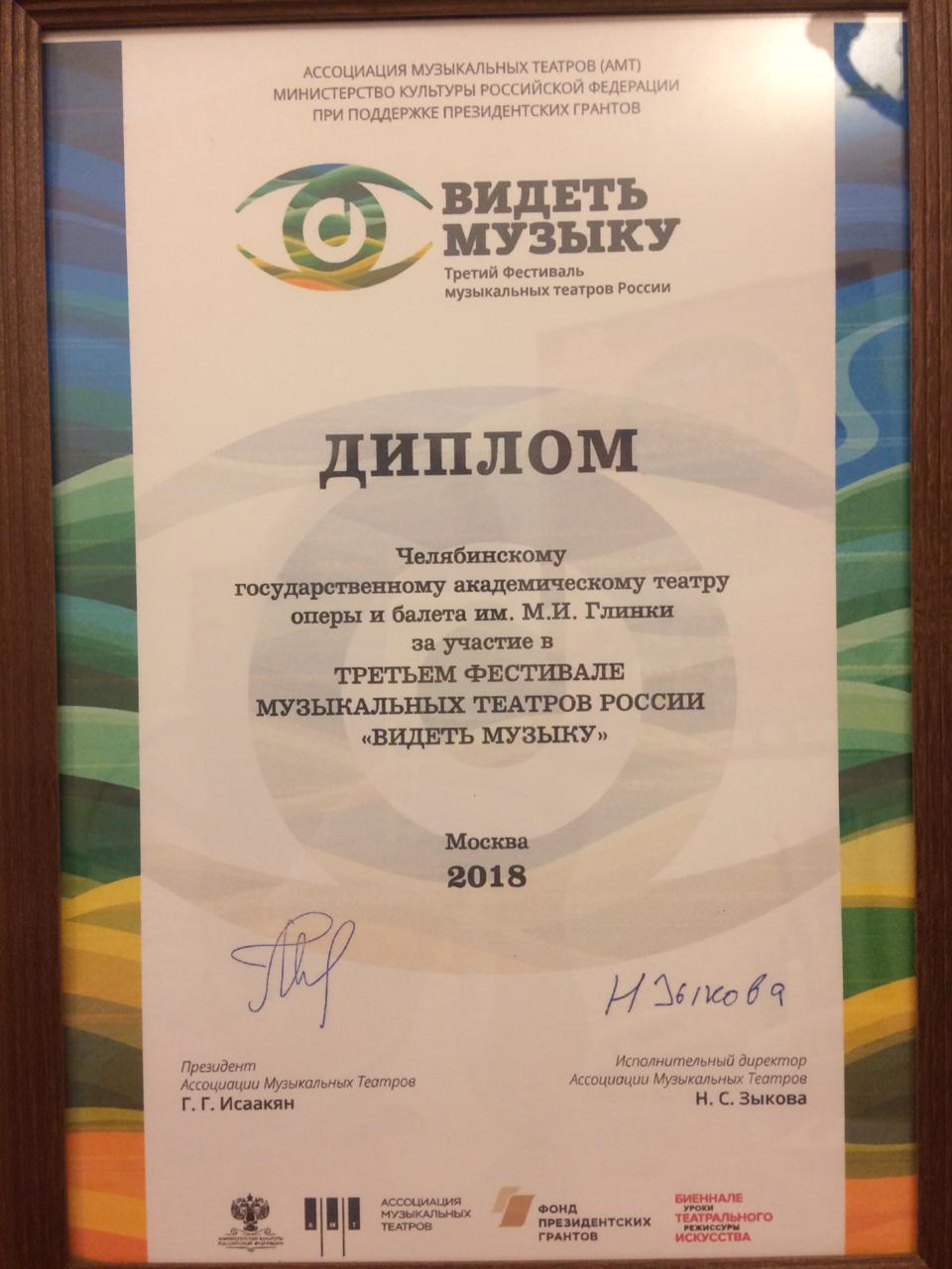 Челябинскому театру оперы и балета вручили диплом за участие в третьем фестивале музыкальных театров России «Видеть музыку».