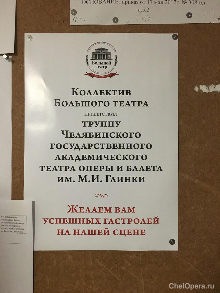 Главный театр страны принял челябинских гастролеров со всем радушием и гостеприимством. Еще на служебном входе нас встретила надпись: «Коллектив Большого театра приветствует труппу Челябинского государственного академического театра оперы и балета им. М. И. Глинки. Желаем вам успешных гастролей на нашей сцене». И действительно, успех сопутствовал нам на каждом выступлении.