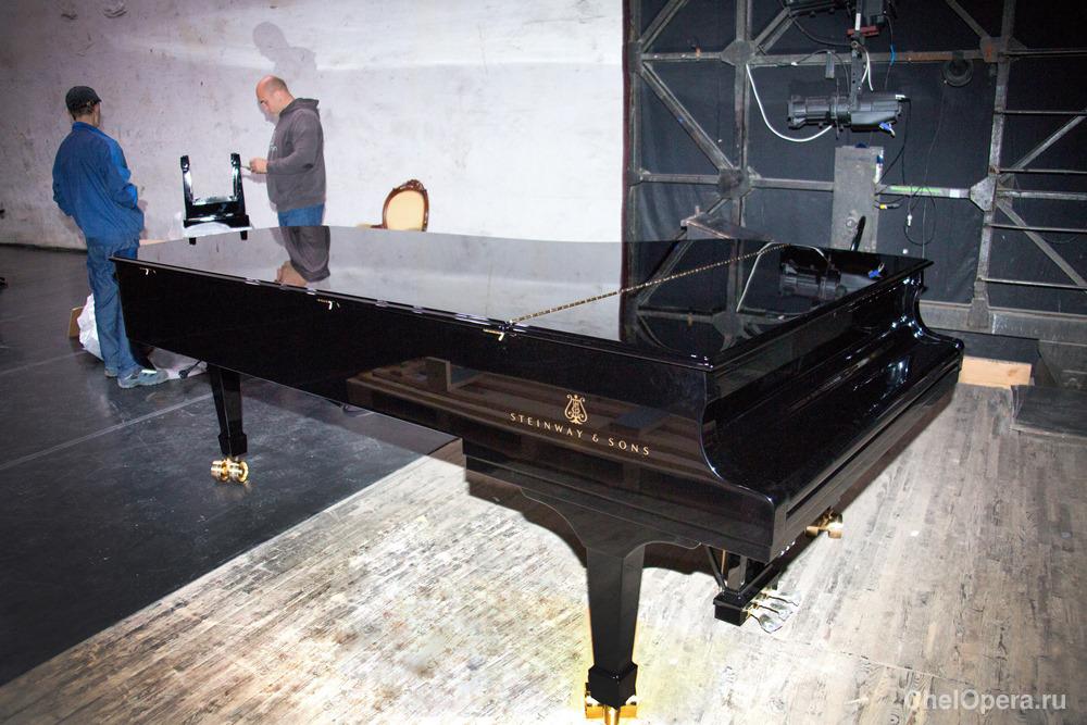 Сборкой занимались десять монтировщиков машинно-декорационного цеха. Весь процесс, начиная от распаковки до прикручивания последнего болтика, контролировал специалист из Москвы, прошедший подготовку на фабрике Steinway в Гамбурге. Сейчас рояль находится в закрытом отсеке бокового кармана сцены – место было специально оборудовано для хранения этого музыкального инструмента.