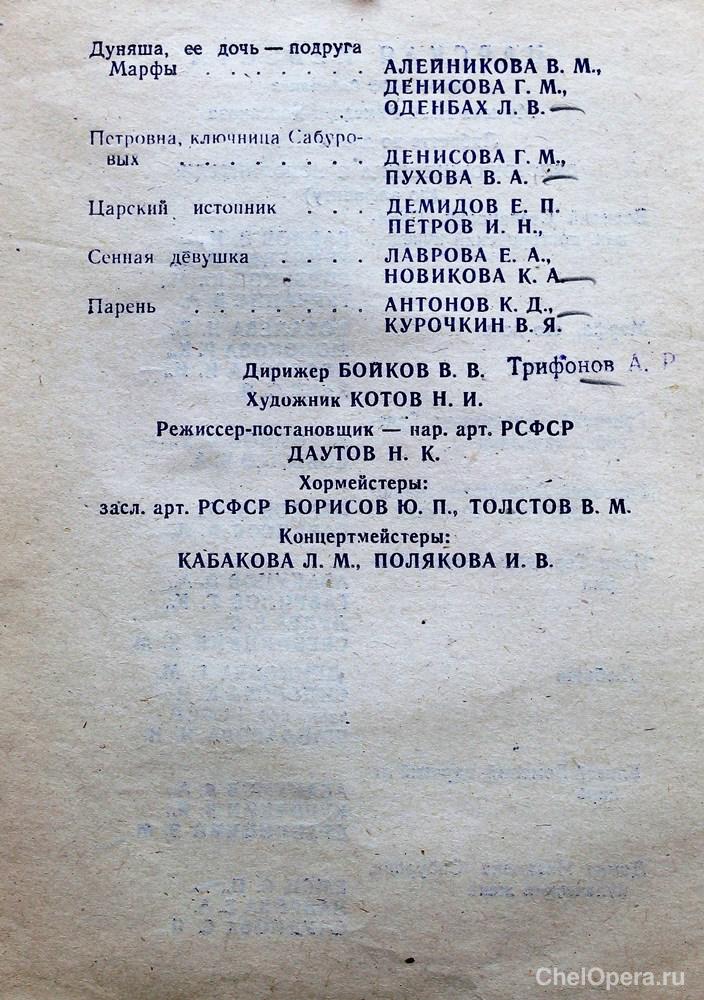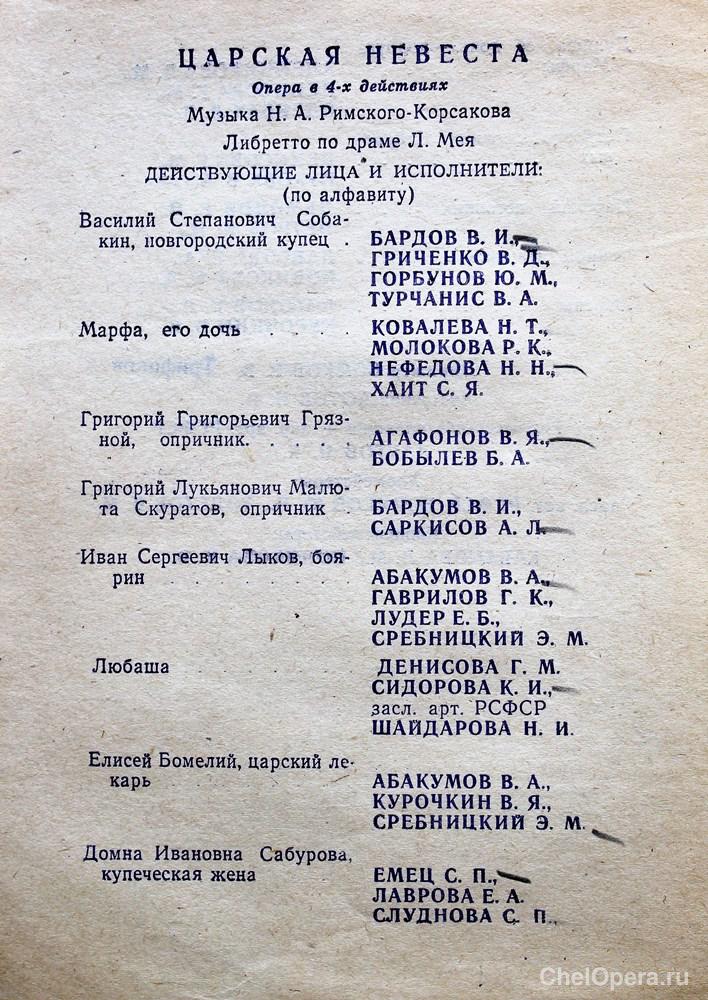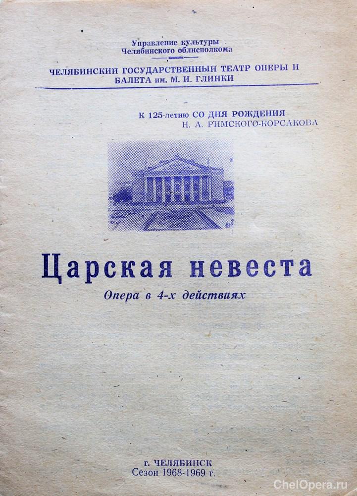 Одно из самых известных произведений Николая Римского-Корсакова в челябинском театре осуществлялось дважды. Первый раз «Царская невеста» вышла на нашу сцену в 1968 году. Спектакль поставил народный артист РСФСР Нияз Даутов. В главных партиях тогда блистали заслуженные артисты РСФСР Валентин Гриченко, Надежда Нефедова, Генриэтта Денисова, Клавдия Сидорова и другие. Постановка была снята с репертуара в 1979 году.