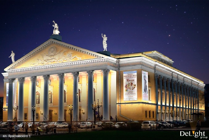 Напомним, капитальный ремонт фасада был проведен два года назад, архитектурно-художественная подсветка станет завершающим этапом преображения внешнего вида театра. Карниз украсят десятки светодиодных светильников и прожекторов максимальной мощности в теплой цветовой гамме, холодные тона будут использоваться только для расстановки акцентов.