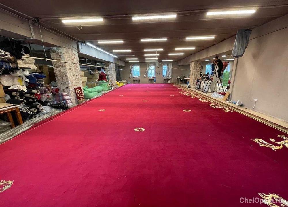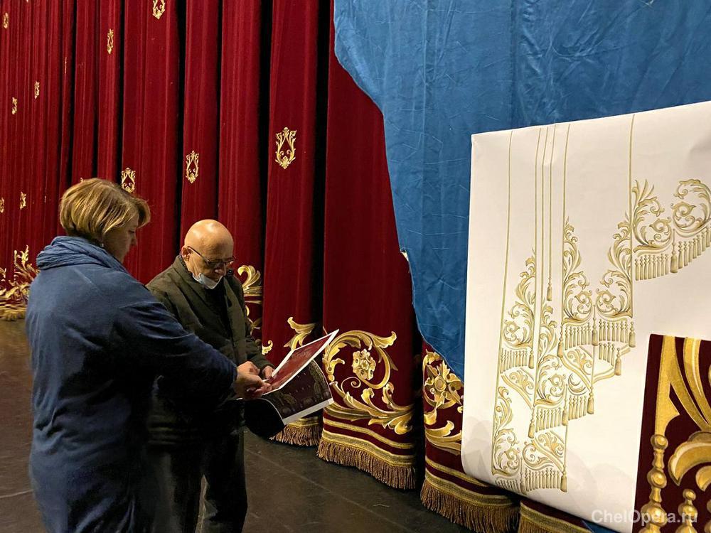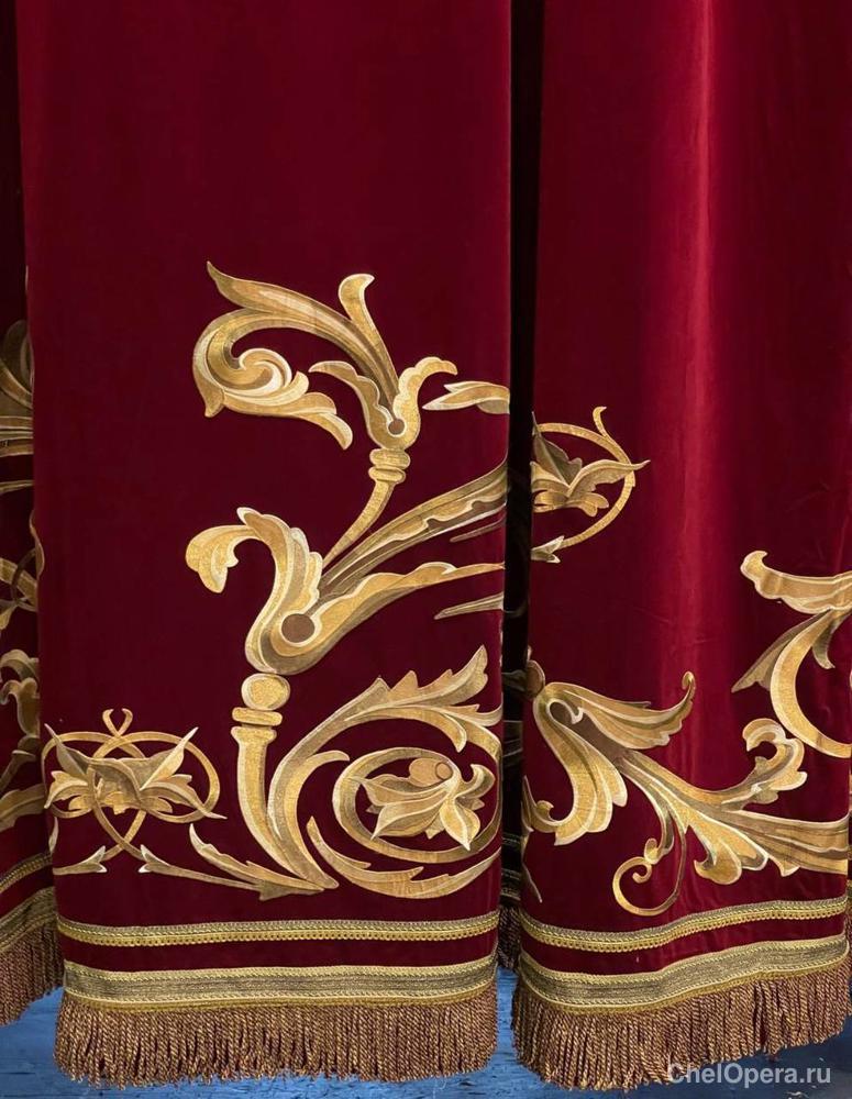 Для пошива использовали специальный театральный бархат высокой плотности. Он отлично драпируется и держит складку, имеет высокие акустические характеристики, является трудновоспламеняемым, хорошо воспринимает сценический свет. Вся партия бархата была произведена в Австрии на заказ под проект челябинского театра. Срок службы изделий из такой ткани измеряется десятилетиями. Многие лидирующие театры Европы и России используют для оформления своих сцен именно этот бархат. В частности из него изготовлены занавесы в Большом драматическом театре Санкт-Петербурга, театрах оперы и балета Екатеринбурга, Астрахани, Уфы, драматических театрах Твери и Ярославля.