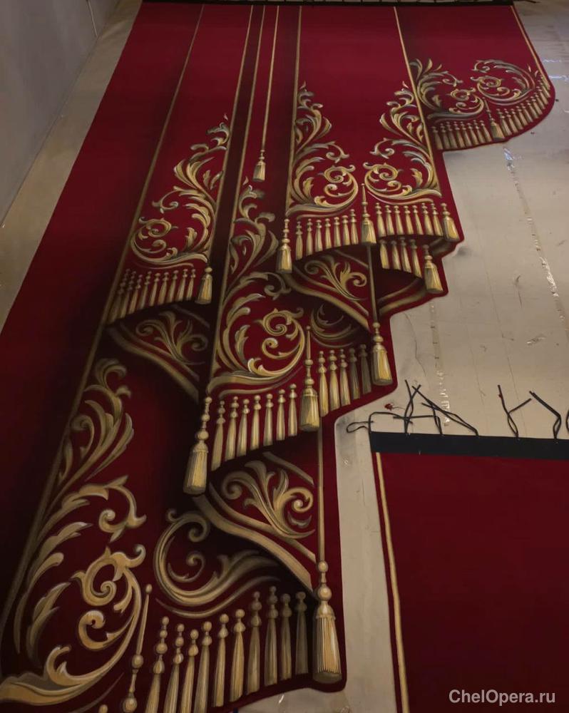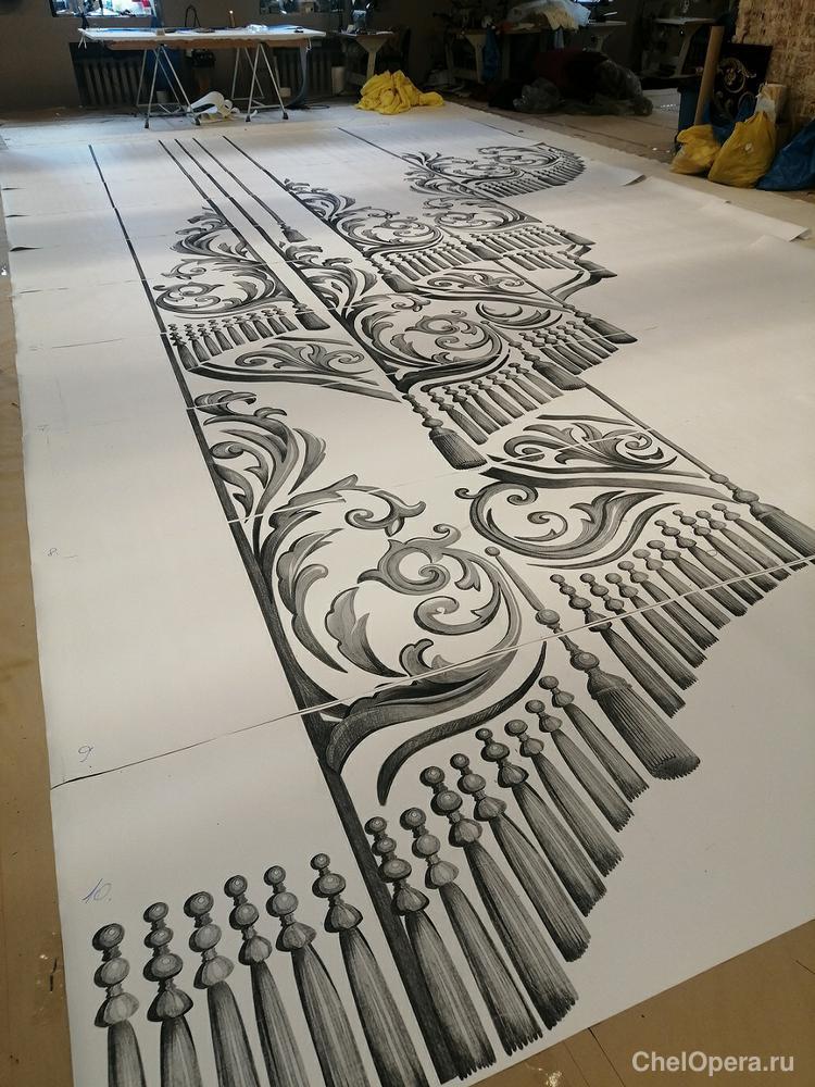 Обычно на производство подобных занавесов закладывается срок от одного года. За это время разрабатывают общий дизайн изделий, производят специальные трудновоспламеняемые ткани и создают живописные эскизы для вышивки, которые затем выполняют в натуральную величину. В дальнейшем их оцифровывают, подбирают фактуру, плотность и материалы, пишут программу для вышивального оборудования и многое другое. Таким образом, производство сложных театральных занавесов занимает иногда больше года. Например, создатели занавеса для Большого театра в Москве вспоминают, что полностью завершили работу за 4 года! В нашем же случае весь процесс занял всего 7 месяцев, и это с учетом ковидных ограничений, проблем с логистикой во всем мире и расстояний между Санкт-Петербургом и Челябинском.