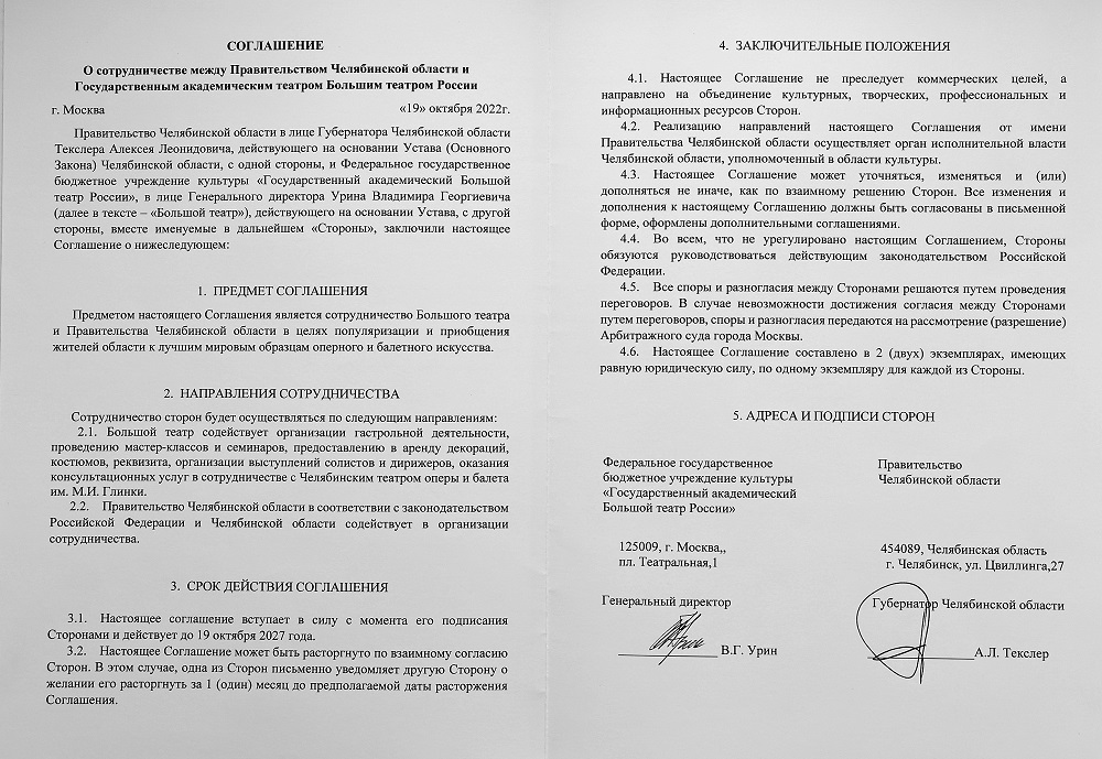 Новое соглашение о сотрудничестве будет действовать до 2027 года. В его рамках Большой театр обещает проводить мастер-классы и семинары, предоставлять в аренду декорации, костюмы и реквизит, содействовать организации выступлений солистов и дирижеров, оказывать консультационные услуги челябинскому театру. Предусматривает соглашение и продолжение обменных гастролей. Так, в октябре следующего года Большой театр собирается трижды показать в столице Южного Урала балет Лео Делиба «Коппелия». В ноябре 2023 года предполагаются гастроли челябинской труппы в Москву. В планах – по два показа балета Сергея Прокофьева «Ромео и Джульетта» и оперы Джузеппе Верди «Аида» на Новой сцене Большого театра.