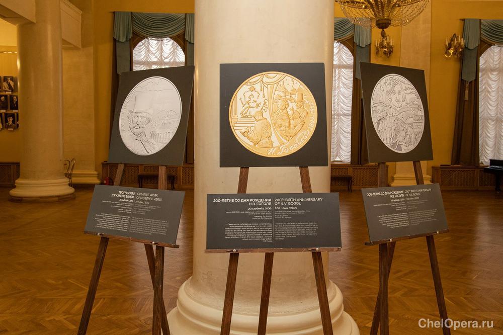 Название выставки – «Магия театра» – отсылает к серебряной монете номиналом 3 рубля, выпущенной в 2018 году в честь Года театра в России. На реверсе монеты изображена в сценическом образе Медея Фигнер – первая исполнительница главной партии в опере «Иоланта» Петра Чайковского. Фотостенд с изображением этой монеты открывает выставку.