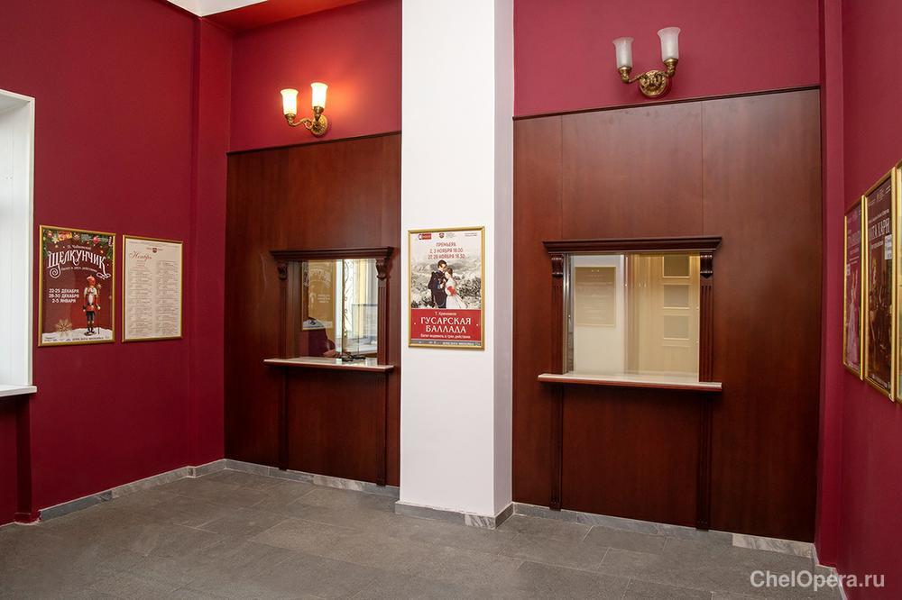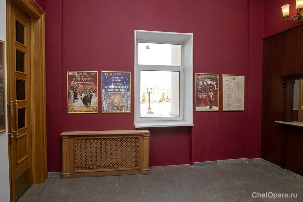 Бледные стены перекрасили в благородный бордовый цвет. Этот же оттенок использовался при ремонте зрительного зала театра в 2022 году. Окна кассы украсили декоративные панели из бука. Отметим, что ремонта в этой части театра не было более 12 лет.