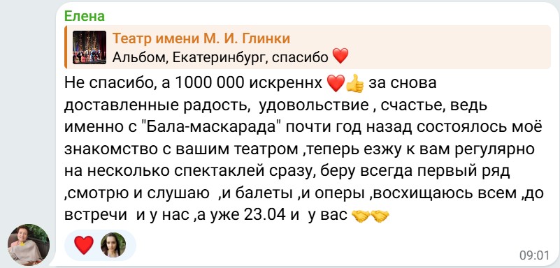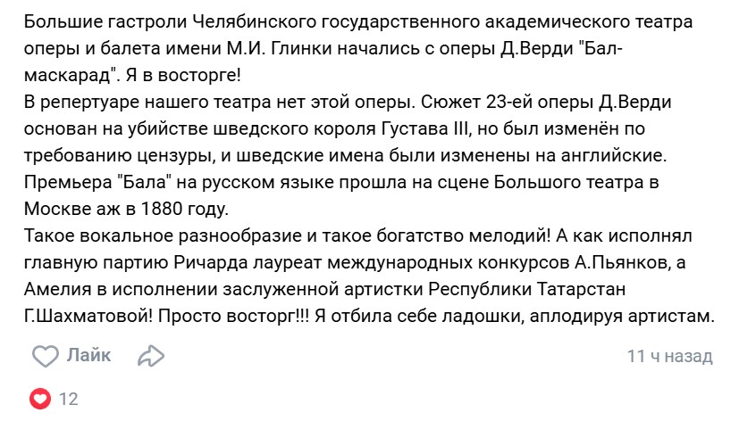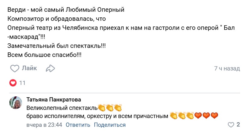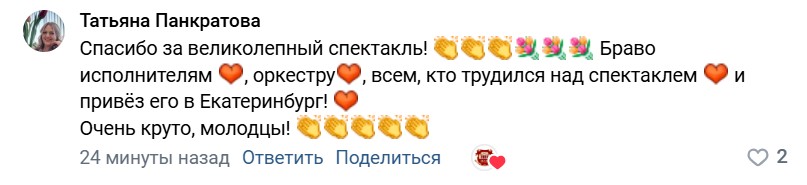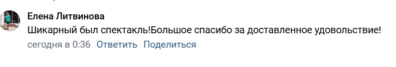 Уральская публика радушно приняла гостей из Челябинска. Артистов искупали в овациях и криках «Браво», которые не смолкали даже после закрытия занавеса. Приводим отзывы зрителей из социальных сетей: