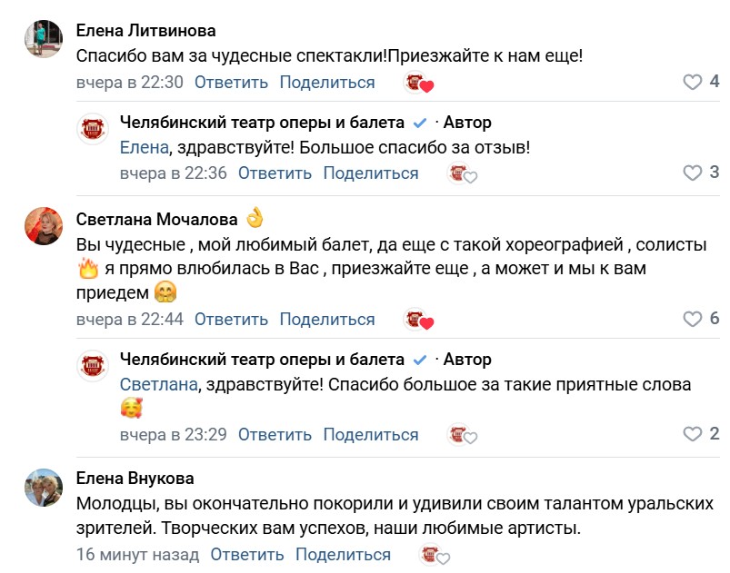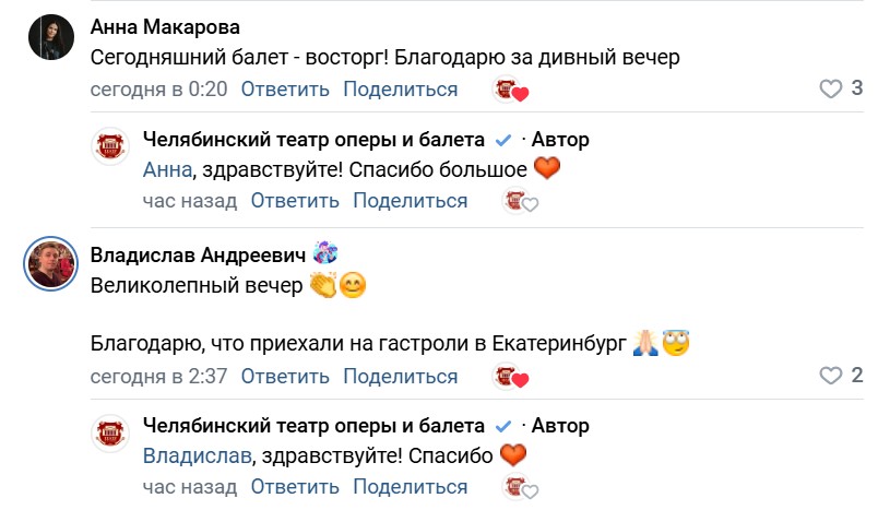 Ярким финальным аккордом гастролей стал балет «Анюта». Великое творение хореографа, народного артиста СССР Владимира Васильева и композитора Валерия Гаврилина – бриллиант нашего репертуара. В 1987 году челябинский театр стал вторым после Большого, где был поставлен этот спектакль. Специально для гастролей обновили практически все костюмы артистов и частично декорации. На сцене Екатеринбурга «Анюта» никогда не исполнялась. Челябинская труппа впервые представила этот шедевр актерского балета уральской публике. В главных партиях выступили заслуженная артистка Челябинской области Екатерина Хомкина-Сафронова, Максим Ананьев, Алексей Шакуро, Александр Кочетков. Вот что пишут в соцсетях зрители о выступлении в Екатеринбурге: