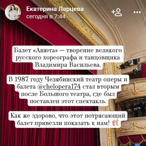Живу в Нижнем Тагиле, дети в Екатеринбурге. Все лучшие балеты Уралоперы смотрели неоднократно. Случайно увидела гастрольный балет "Анюта" и немедленно купила три билета; себе, дочери и внучке. Очень ждала этого события! Незнакома с труппой и обожаю это произведение. Трижды смотрела в Перми, 5 лет назад даже с участием Владимира Васильева в своей роли в рамках Конкурса Арабеск. И вот гаснет свет, звучит дивная музыка в исполнении замечательного, сыгранного оркестра и начинается ВОЛШЕБСТВО!!! Очень редко в последнее время можно испытать культурный шок по совокупности причин... Этот тот случай! На одном дыхании пробежало 1 действие. Ошеломляющий успех главной героини!! Перетанцевать Максимову, естественно, невозможно, но владея отличной техникой оказалось можно передать душевное состояние, нравственные терзания языком тела. Какие же говорящие руки и ноги Екатерины! Легкость, грация, пластичность невероятная, зашкаливающий драматизм... Нет слов от восхищения и восторга. Это жемчужинка театра! Хорош Модест Алексеевич, крики БРАВО сопровождали его выступление. Просто гуттаперчевый. Какая выворотность, какой прыжок! Невозможно хорош Петр Леонтьевич. Очень точно драматически, ловила себя на том, что вижу версию Васильева. Последняя мизансцена - уход троицы - душераздирающая безысходность и моя 8-летняя внучка горько плачет... Ребенка не обманешь! Его Превосходительство настолько безупречен, что не хватает словарного запаса и восхищенных эпитетов! Более того, спектакль явил настолько единый образ, что трудно разделить танцы солистов и артистов балета. Одним словом, испытали все втроем полнейший восторг и потрясение. Это очень мощно и не забудется никогда. Уже решила для себя в следующий театральный сезон побывать в Челябинске на любимых балетах. Низкий поклон и огромная благодарность всему творческому коллективу за подаренное открытие и радость! За ваш нечеловеческий труд, стоящий за легкостью и красотой. Удачи и человеческого счастья. СПАСИБО!!!