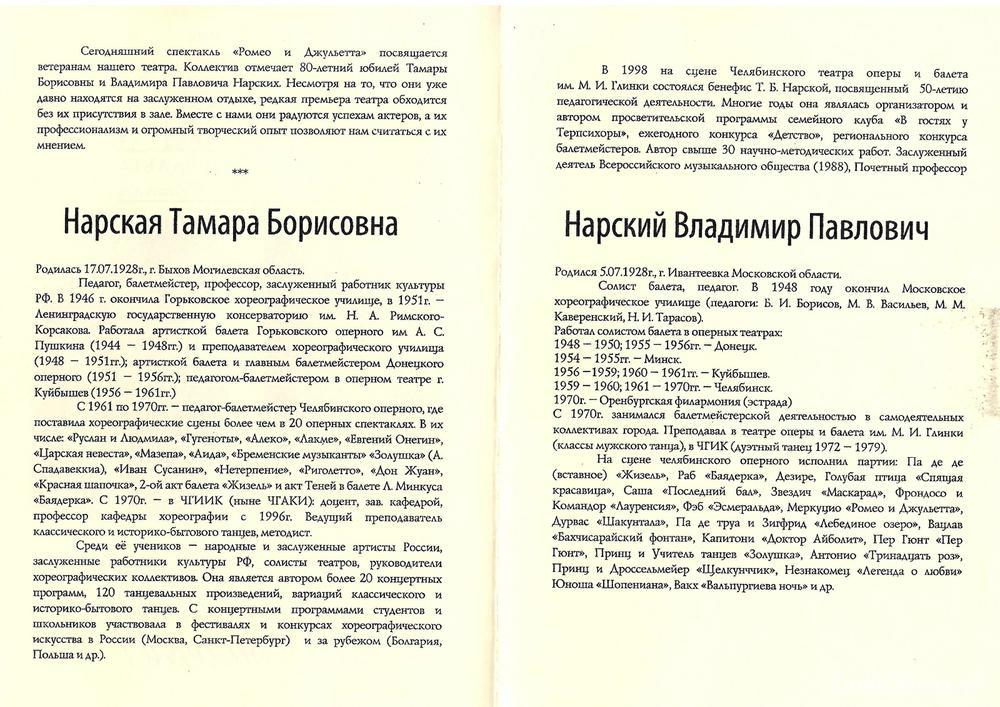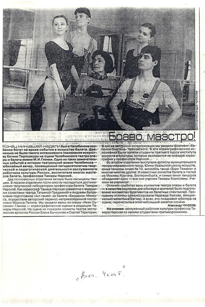 Заслуженный работник культуры РСФСР Тамара Нарская (17.07.1928-2.07.2022) в годы Великой Отечественной войны трудилась в тылу, принимала участие в концертах для солдат. Челябинскому театру она посвятила 37 лет в качестве балетмейстера и педагога-репетитора.