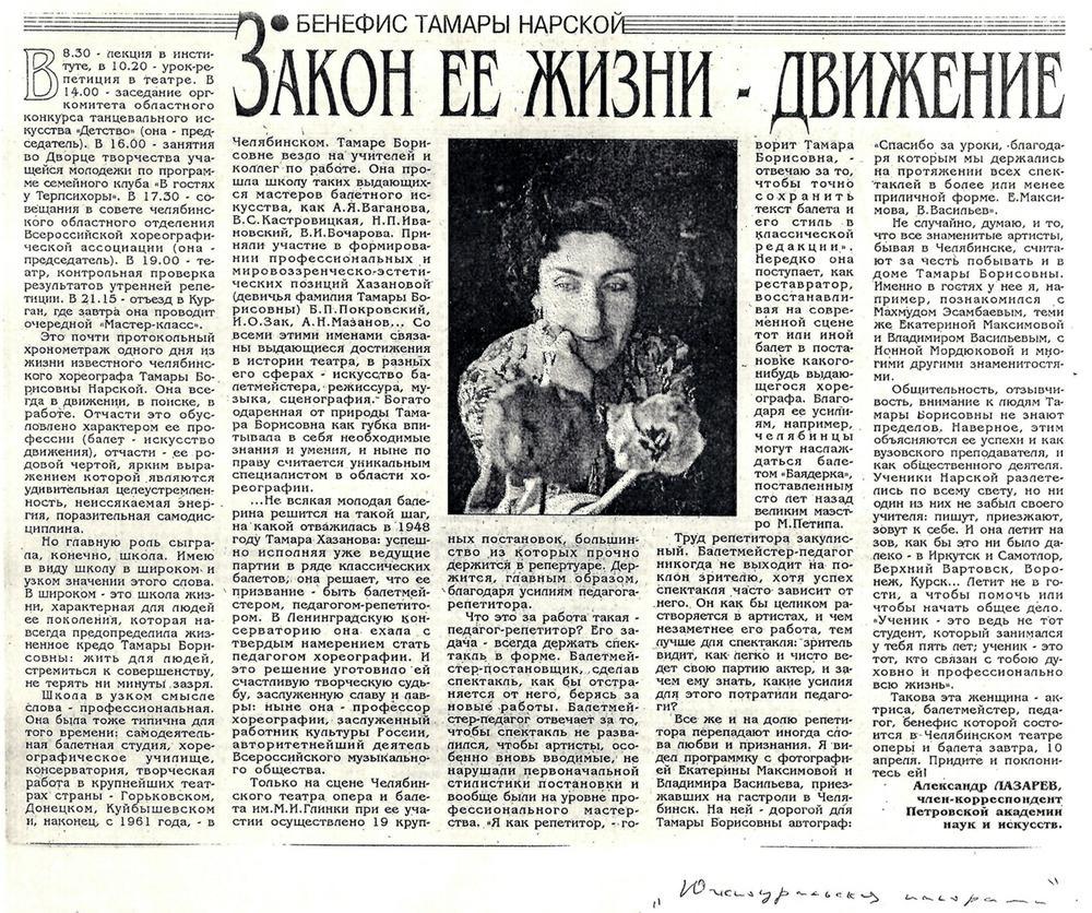 В 1961 году Тамара Борисовна получила приглашение занять должность репетитора балета в челябинском театре. К тому времени здесь на протяжении сезона ведущим солистом балета работал ее супруг –  Владимир Павлович Нарский.