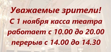 Уважаемые зрители! С 20 августа касса театра работает в прежнем режиме: ежедневно с 10:00 до 20:00, перерыв с 14:00 до 14:30.