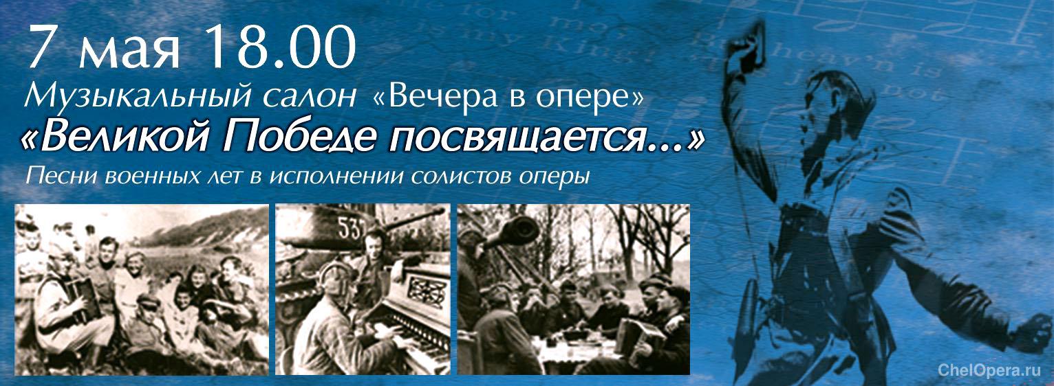 Накануне Дня Победы театр оперы и балета подарит Челябинску музыкальный вечер в рамках цикла программ «Вечера в опере». В фоей тетра артисты оперной труппы исполнят песни военных лет. Эти мелодии широко известны всей стране, их пели и поют не только 9 мая. Произведения Дунаевского, Пахмутовой, Окуджавы и других авторов стали в буквальном смысле народными. В программе прозвучат легендарные песни: «Темная ночь», «Вечер на рейде», «День Победы», «Смуглянка», «Майский вальс», «Катюша», «Ехал я из Берлина»…