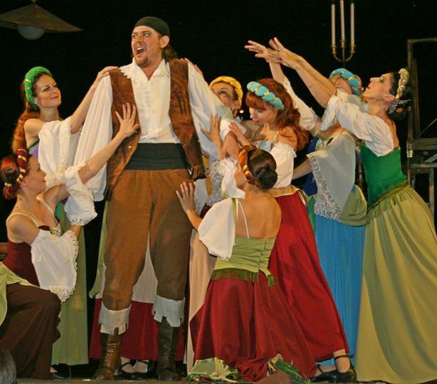 В начале было слово. То есть пьеса В.Шекспира “Укрощение строптивой” положена в основу мюзикла К.Портера “Целуй меня, Кэт!”. Решен спектакль как “театр в театре”. И театре, увы, не бродвейском. Все смешалось в этом храме Мельпомены. То ли Фред Грэхем, он же Петруччо, укрощает Лилли Ванесси. То ли Лилли Ванесси, она же Катарина, укрощает Фреда Грэхема. В вечном как мир противостоянии мужчины и женщины ломают копья Фред и Лилли. Нешуточные баталии идут с переменным успехом. И кто тут укротитель, а кто укрощаемый, решать Вам, зритель.