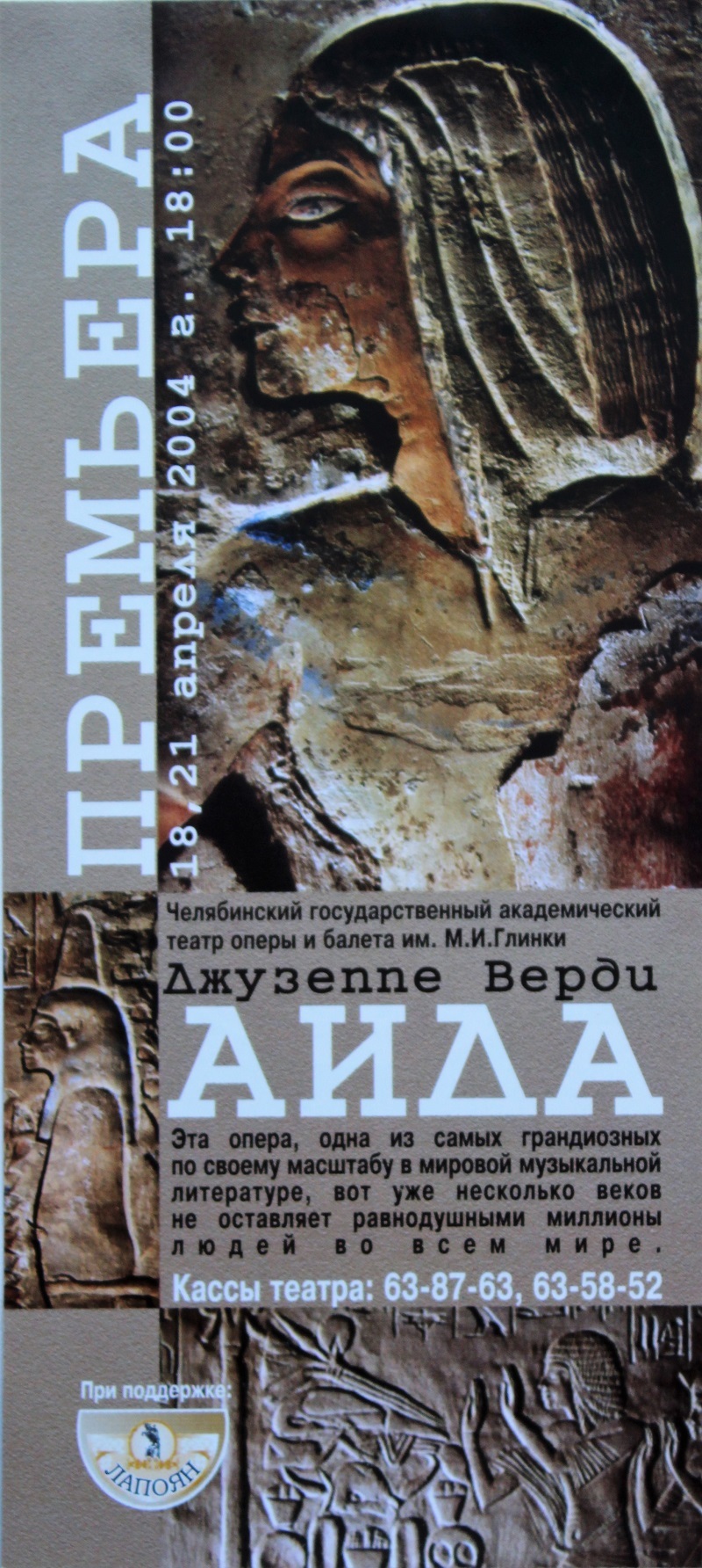 Одна из самых гениальных опер Джузеппе Верди – «Аида» – никогда надолго не покидала репертуар челябинского театра. Первая постановка была осуществлена в 1961 году, а сейчас на сцене идет уже пятая версия спектакля.