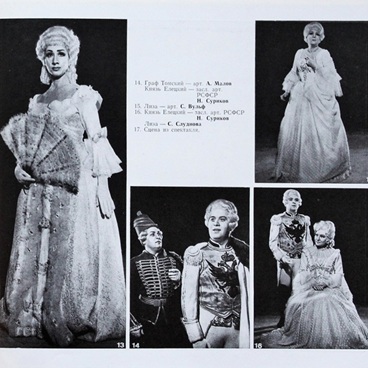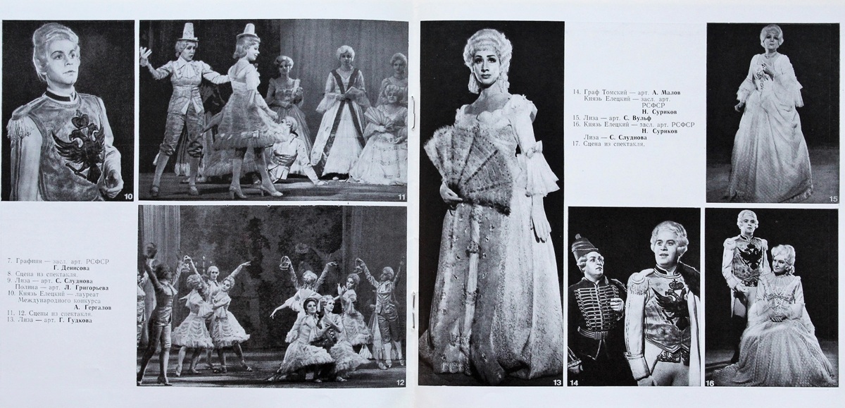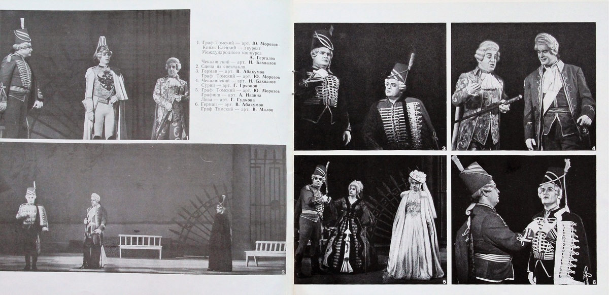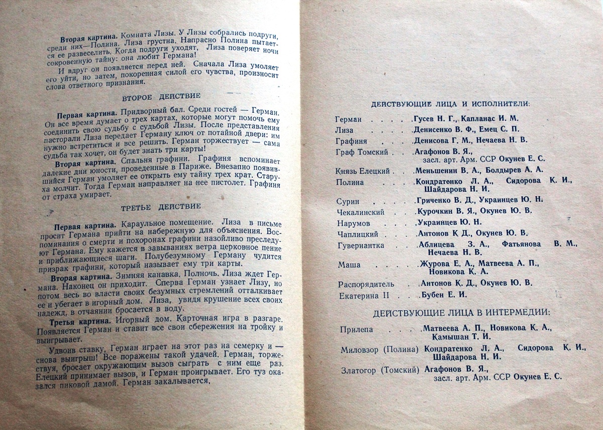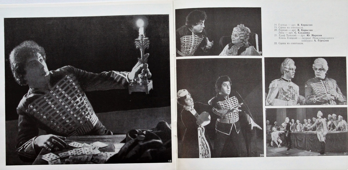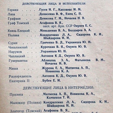 В роли Лизы на сцену выходили Светлана Слуднова, Светлана Вульф, в роли Графини – заслуженная артистка РСФСР Генриетта Денисова. В партии Германа выступал Вилен Абакумов.
