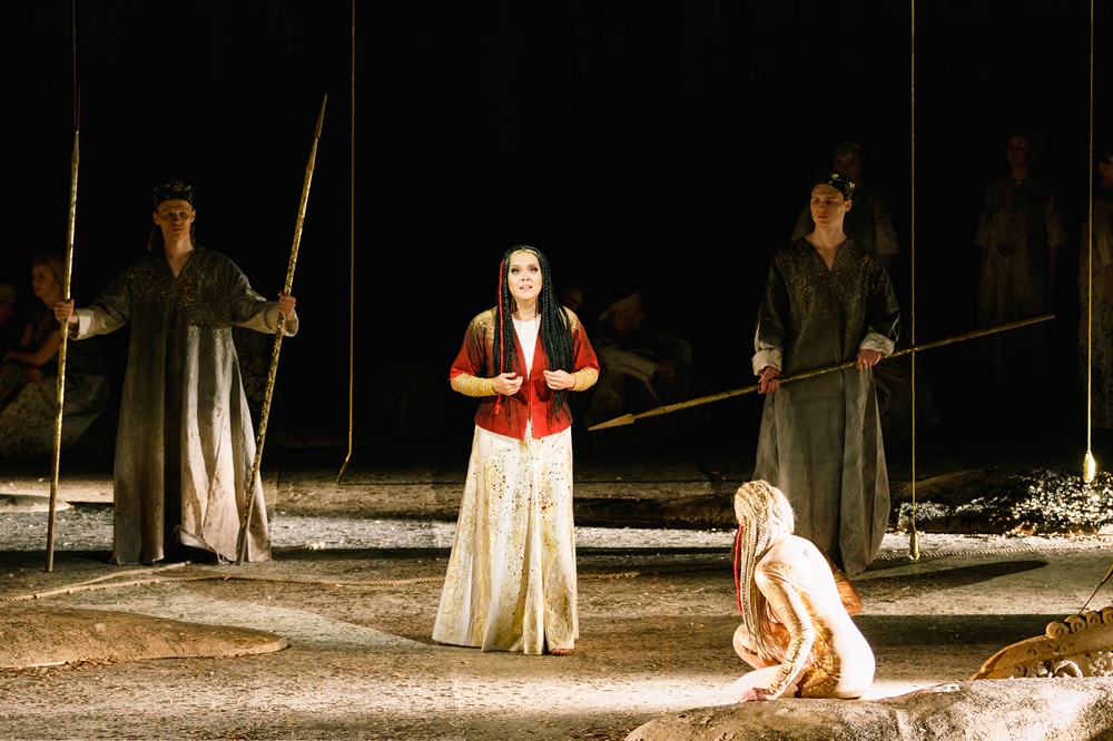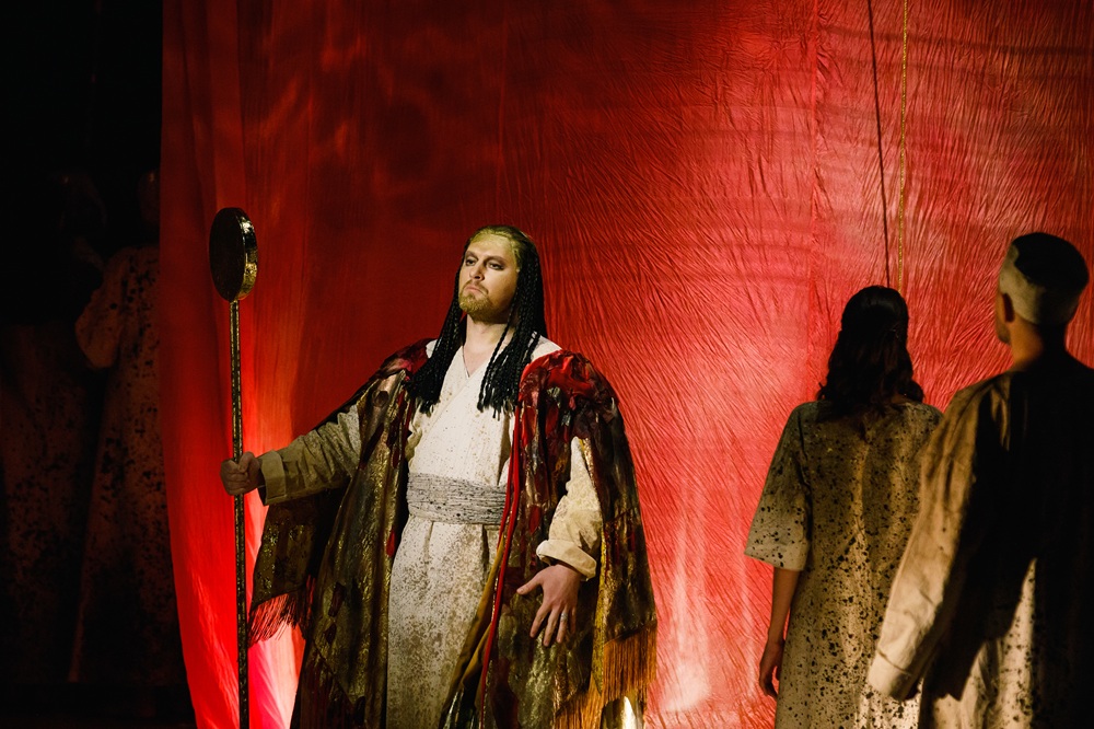 Лаконичность сценографии тем не менее производила яркое впечатление: световая партитура Сергея Скорнецкого эффектно «превращала» светлые балахоны и плащи хора и солистов в золотые одеяния. Исключение составила Абигайль, одетая в дразнящую взгляд красную блузу. «Капли» красного были и на мантии Набукко, недвусмысленно указывающие на родство этих персонажей – по крови и по свирепству нрава.