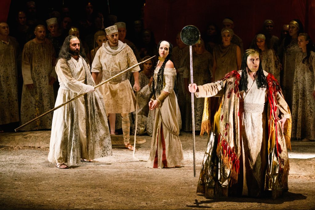Впрочем, публика с интересом погружалась в перипетии противостояния древних народов и сопереживала коллизии, случившейся с Набукко. Ослепленный гордыней, он провозгласил себя богом и был в тот же миг поражен ударом свыше. Для этого момента было найдено эффектное сценографическое решение: громадный зеркальный диск треснул за спиной впавшего в безумие царя, и осколки осыпали сцену. Потом они станут щитами в руках воинов и Абигайль, которая в своей гордыне и злобе превзойдет отвергнувшего ее отца.