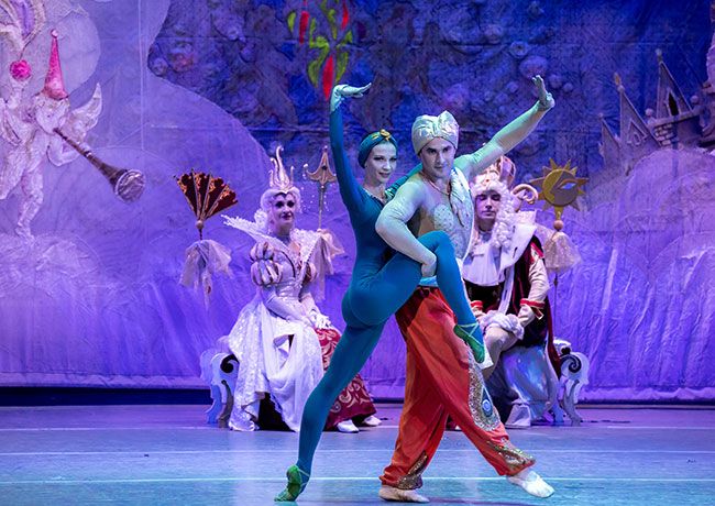 Новогодняя, невероятно сказочная атмосфера на сцене создана благодаря шикарным работам над декорациями и костюмами прекрасного художника, действительного члена Российской академии художеств Дмитрия Чербаджи.