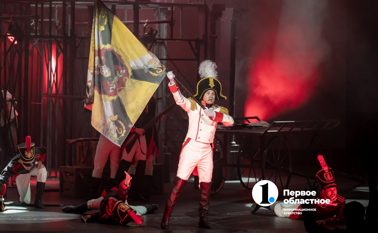 Первое действие — мирная часть романа, во второе действие вторгается война с Наполеоном. По сцене маршируют солдаты с ружьями, катают полноразмерные пушки, реют флаги, командует Кутузов.