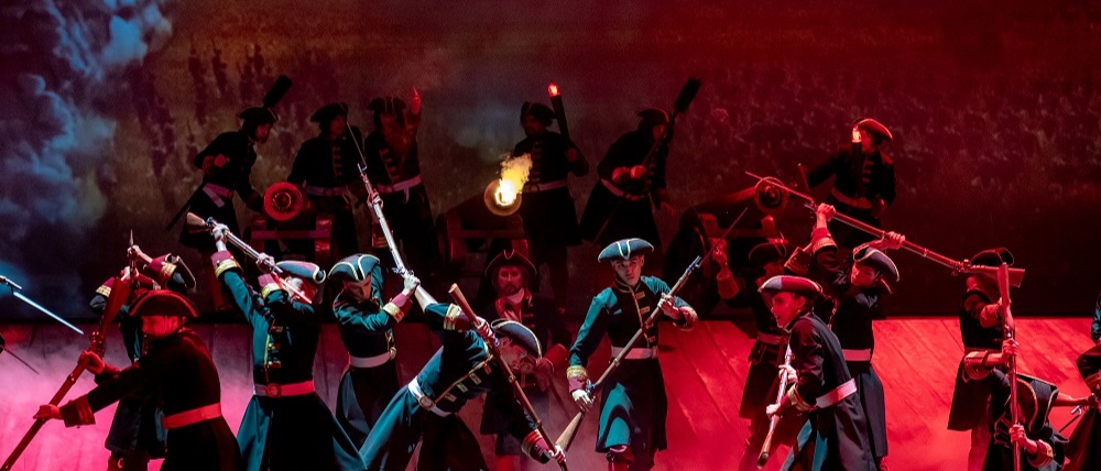 К слову сказать, кроме шведского короля и его придворных, на сцене совсем нет вражеской армии. То есть никакой шведской армии, иностранных военных мундиров на российской сцене нет. Всё благодаря таланту режиссёра-постановщика заслуженного деятеля искусств России Иркина Габитова, художника-постановщика и художника по костюмам народного художника России Вячеслава Окунева, художника по видео Виктории Злотниковой. Иностранные флаги, пушечные ядра, воинственный неприятель – всё это существует в качестве 3D-графики.
