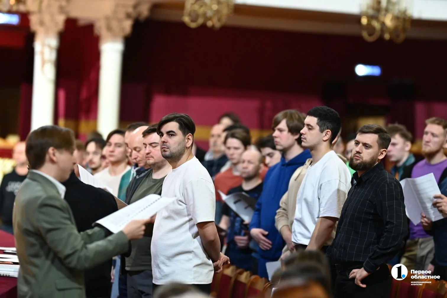 Хор — на зрительских местах, музыканты — в оркестровой яме. Это пока, на репетиции, певцы сидят в зале, ведь прямо в этот момент за железным занавесом монтируют декорации для сегодняшней оперы «Аида». А уже в субботу все артисты поднимутся на сцену, чтобы представить совершенно новую для Челябинска программу.